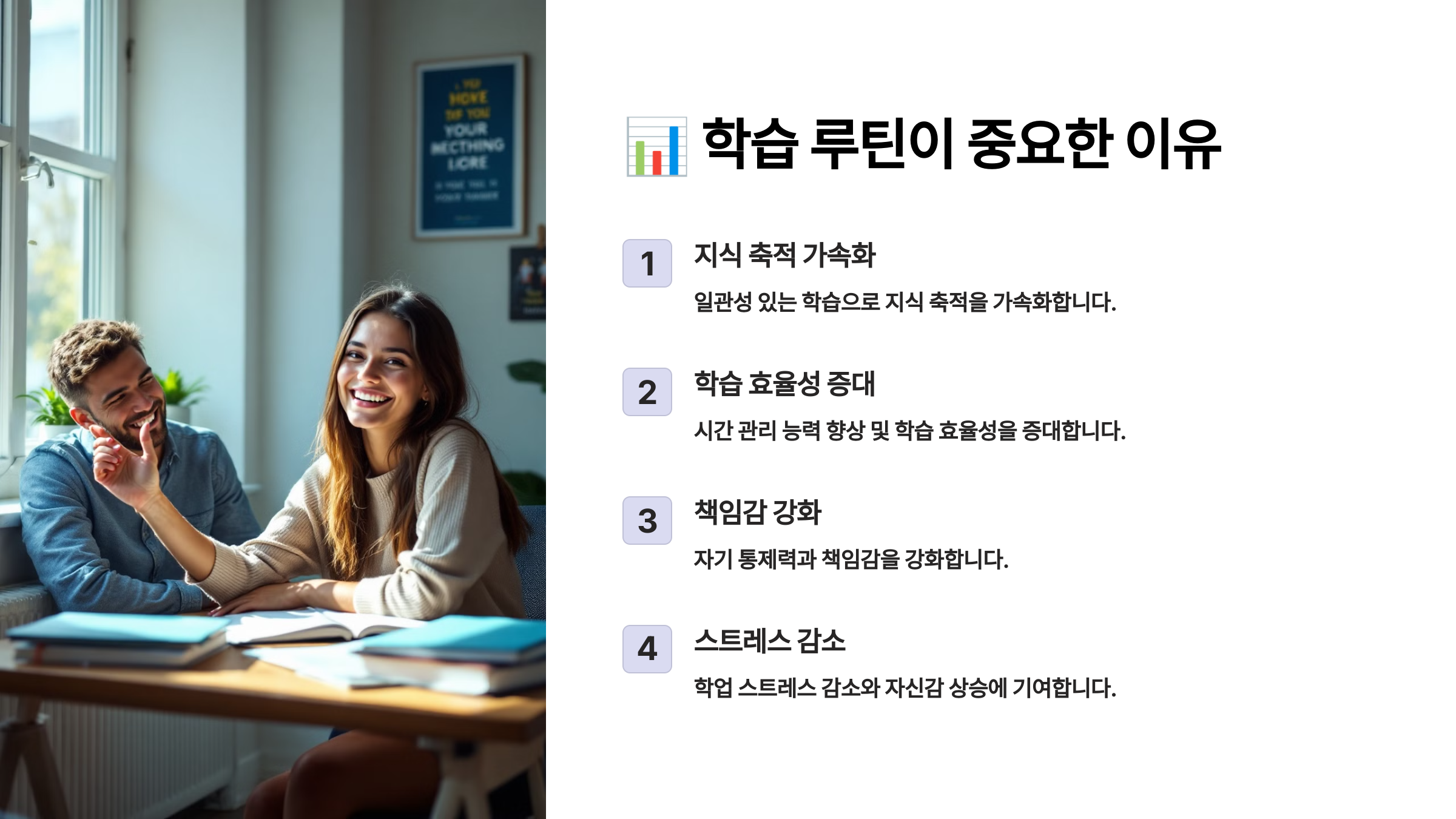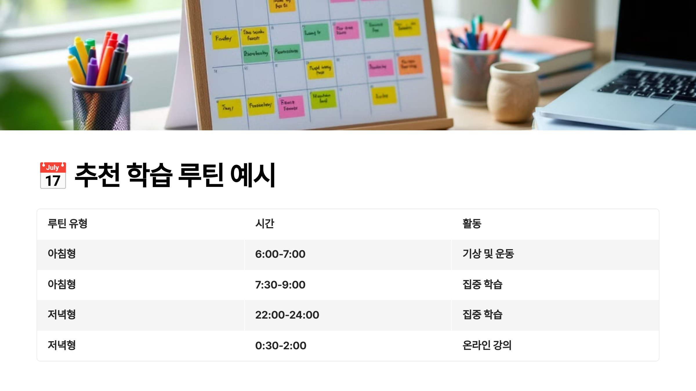 | 📈 학습 효율 증가 | 규칙적인 루틴을 따르면 기억력과 이해력이 좋아짐 |