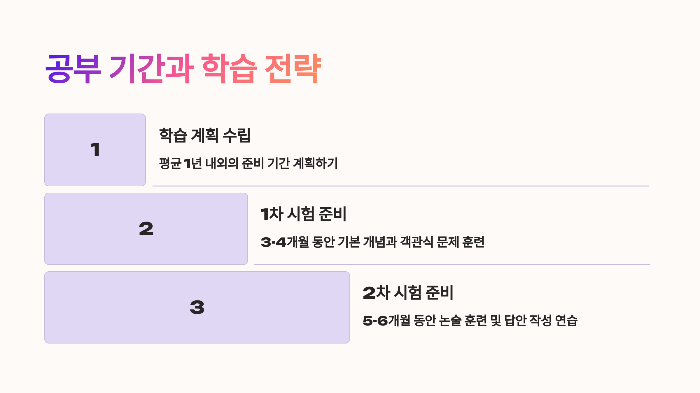 🧠 공부 전략은 “기본 개념 정리 → 기출 반복 → 논술 실전훈련” 순으로 짜는 게 가장 효과적이에요. 특히 2차는 ‘쓰는 연습’이 핵심이기 때문에, 정리보단 손으로 써보는 연습이 훨씬 중요해요.