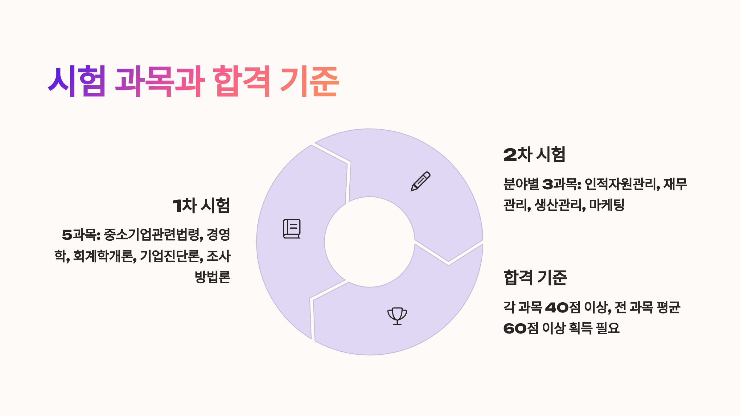 📖 경영지도사 시험은 1차, 2차, 면접 총 3단계로 구성돼요. 각 단계마다 평가 방식이 다르고, 난이도도 점점 높아지는 구조라서 전략적인 학습이 필수예요.