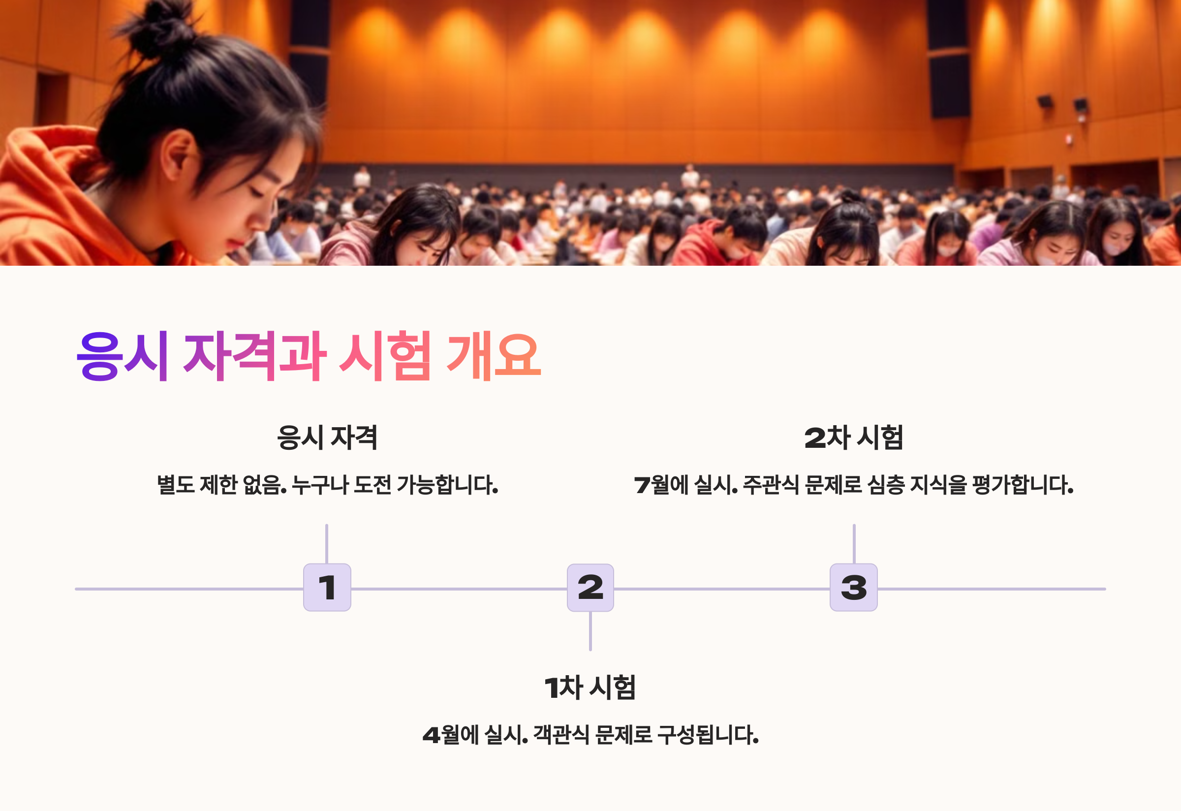 📌 다음은 “🧾 응시 자격과 시험 개요”예요. 누가 응시할 수 있는지, 어떤 시험이 진행되는지 전반적인 구조를 살펴볼게요!