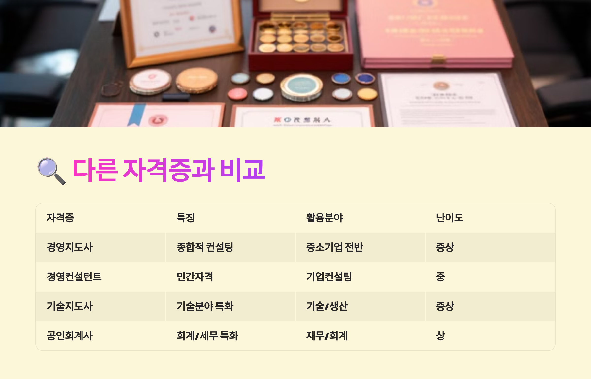 📚 경영지도사는 중소기업을 위한 전략·마케팅·재무 등 전반적 경영자문을 수행하는 국가공인 컨설팅 전문가 자격이에요.
