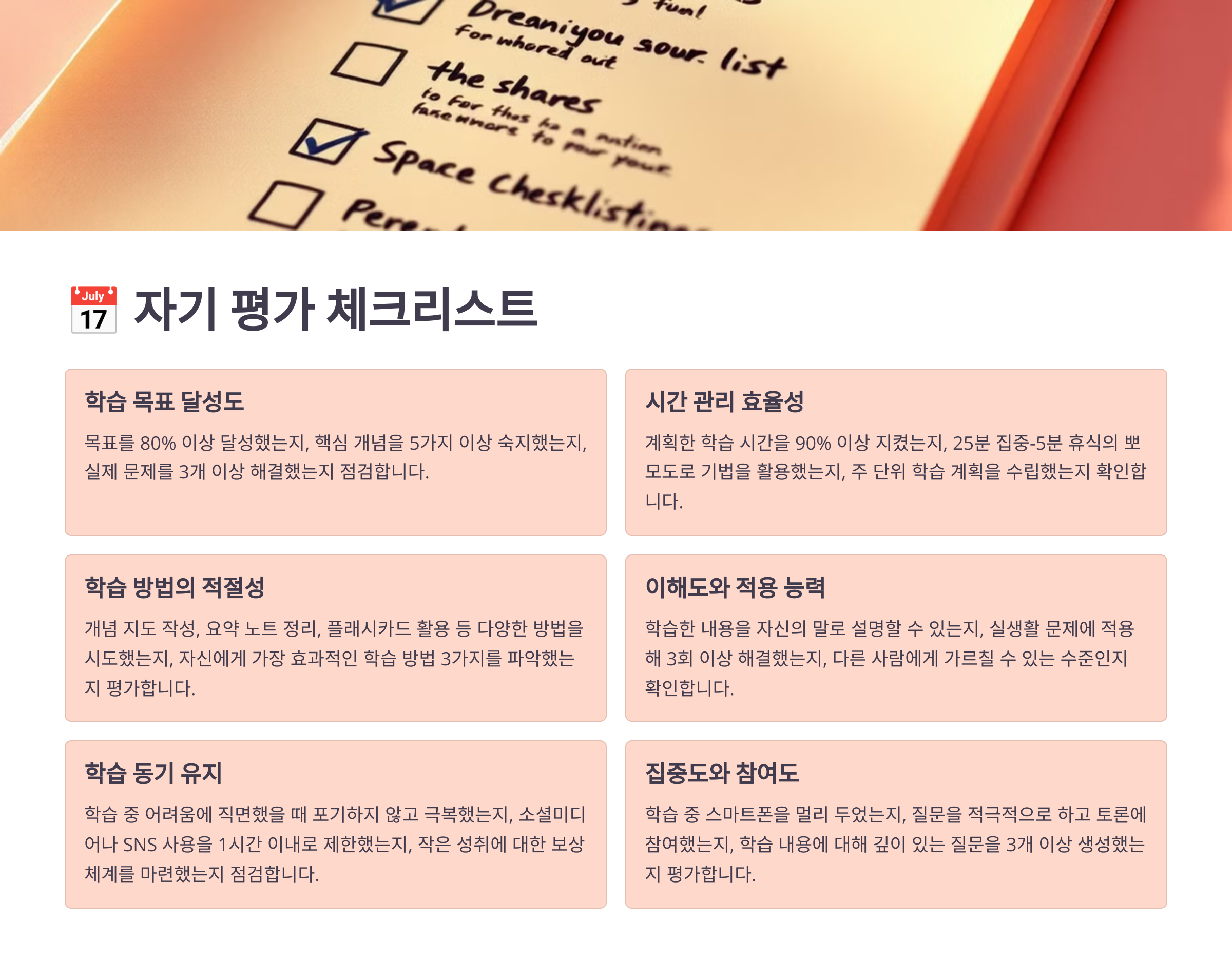 📅 자기주도 학습을 효과적으로 하기 위해서는 체계적인 자기 평가가 필요해요. 아래 체크리스트를 활용해 자신의 학습을 점검해보세요!