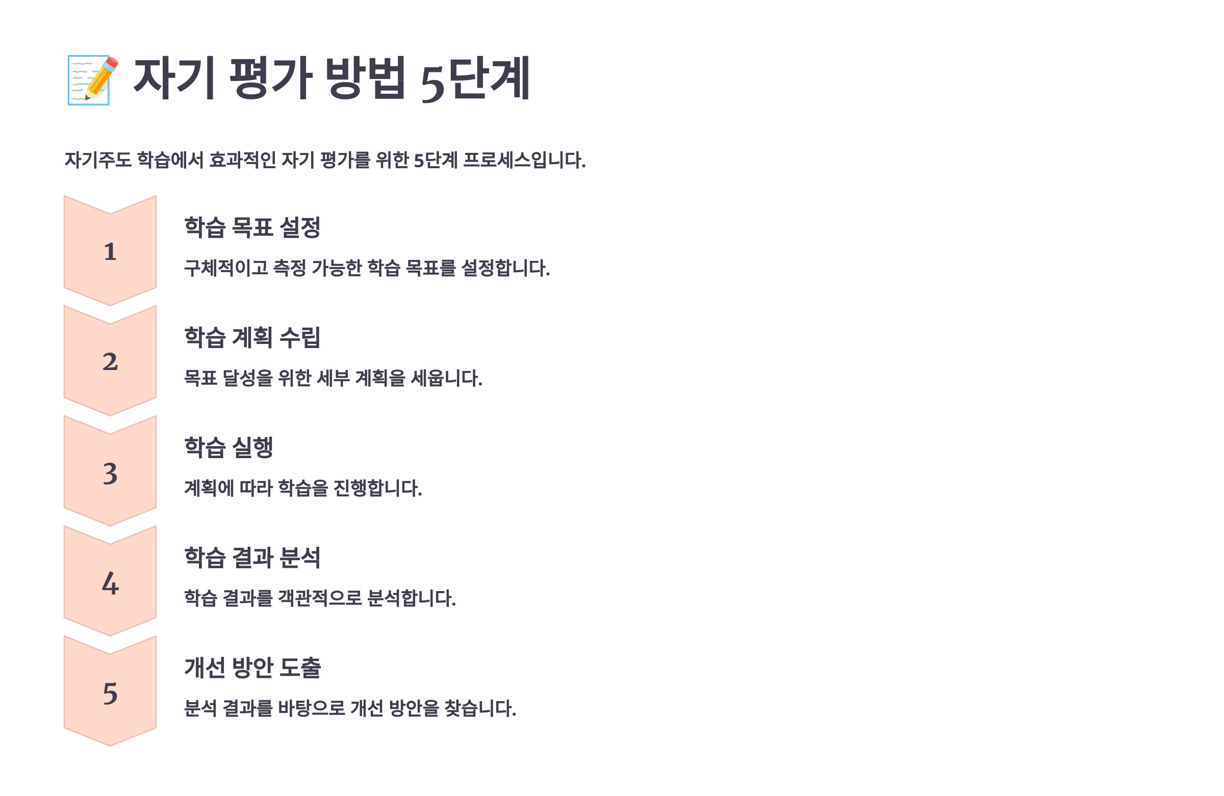 📝 자기주도 학습에서 가장 중요한 것은 정기적인 자기 평가예요. 자기 평가를 통해 부족한 점을 보완하고 학습 방법을 개선할 수 있어요.