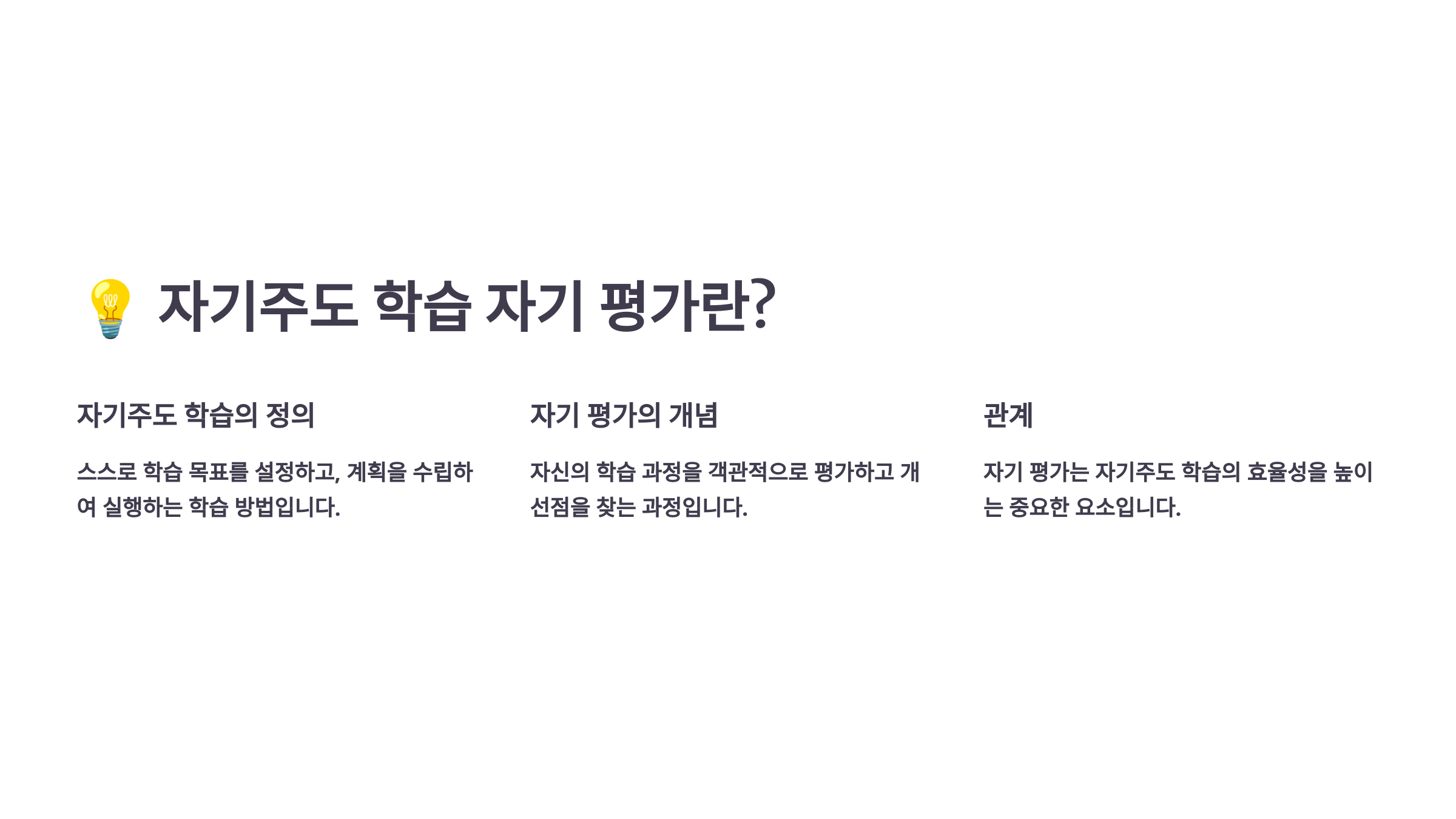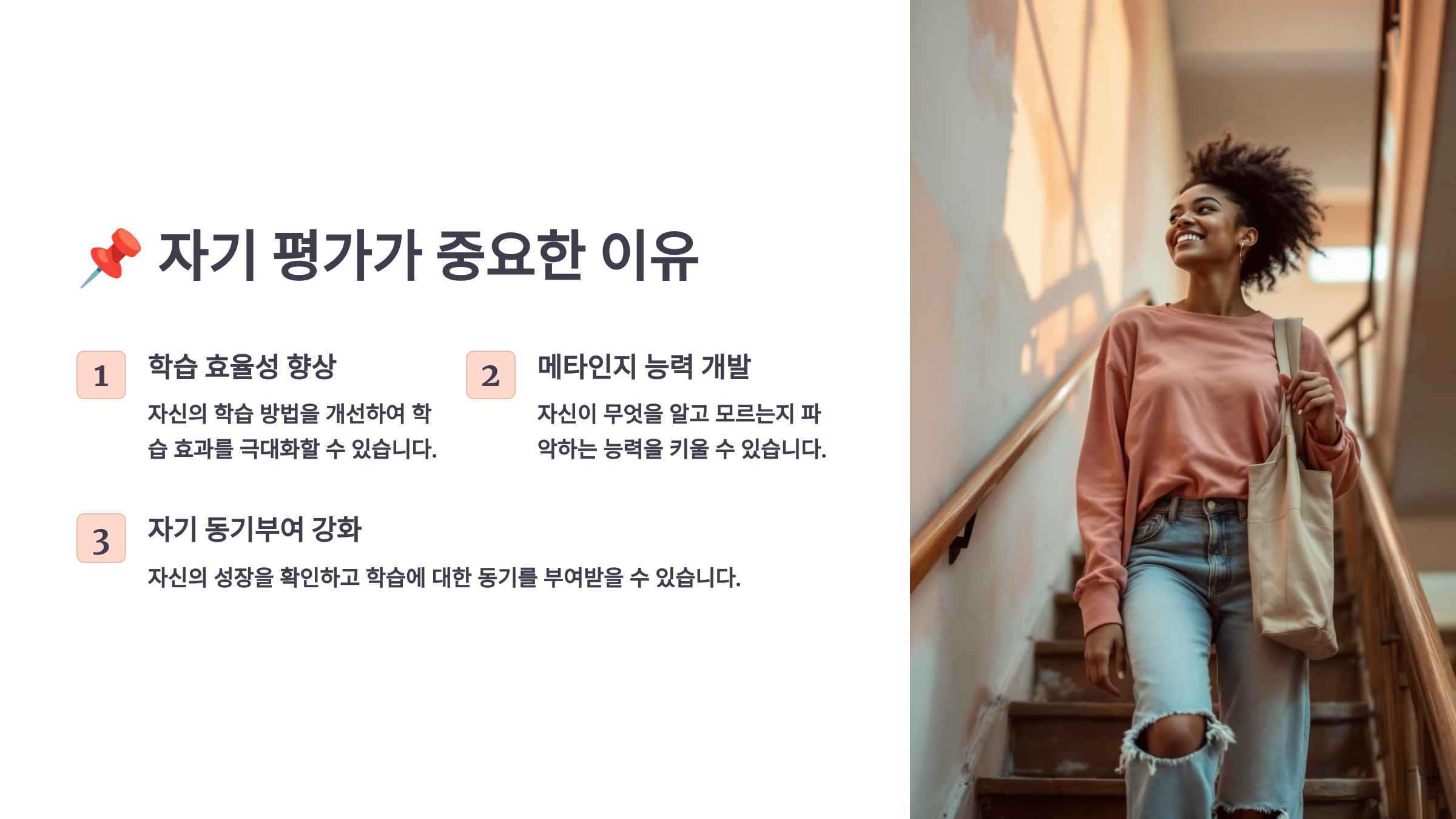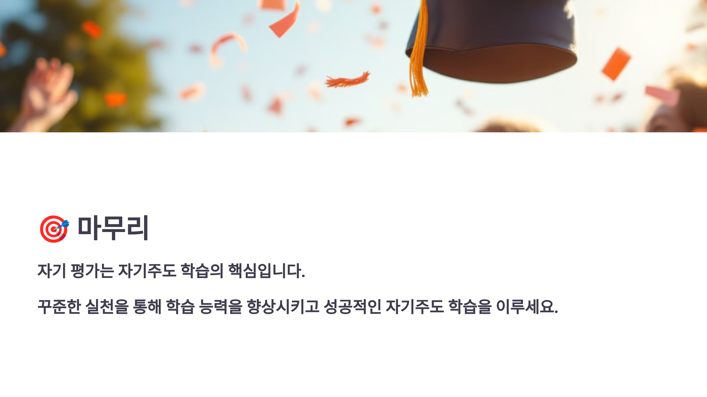 📌 자기주도 학습에서 중요한 것은 공부를 많이 했느냐가 아니라, 얼마나 효과적으로 공부했느냐예요. 자기 평가를 하면 학습 성과를 점검하고 더 나은 방향으로 나아갈 수 있어요.