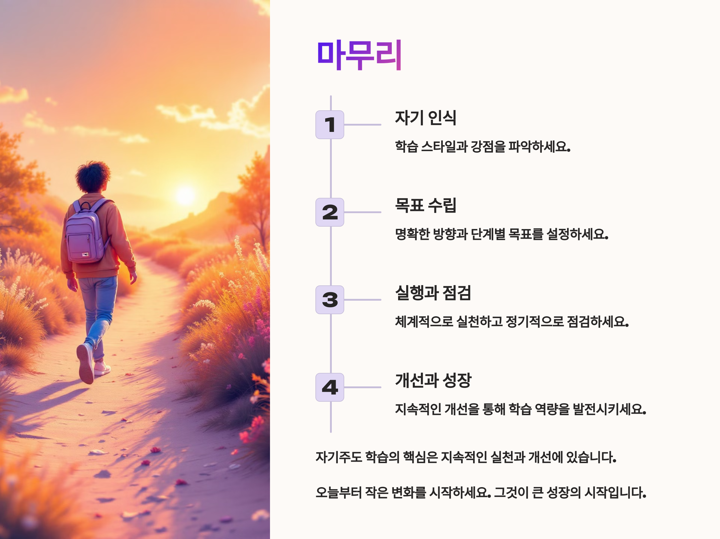 이처럼 자기주도 학습을 잘 관리하면 공부 효율이 올라가고, 성취감도 높아질 수 있어요! 🚀