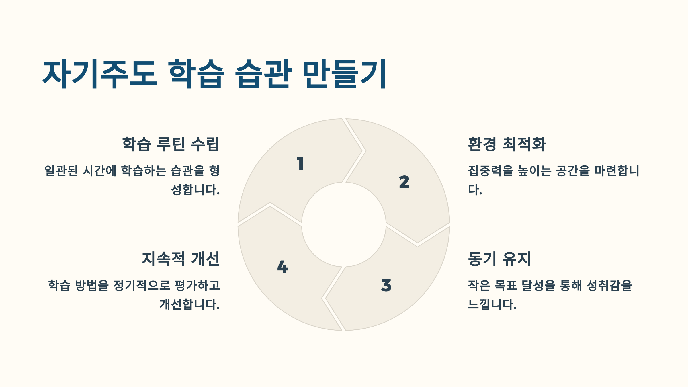 자기주도 학습은 하루아침에 완성되지 않아요. 꾸준한 습관을 만드는 것이 가장 중요해요! ⏳