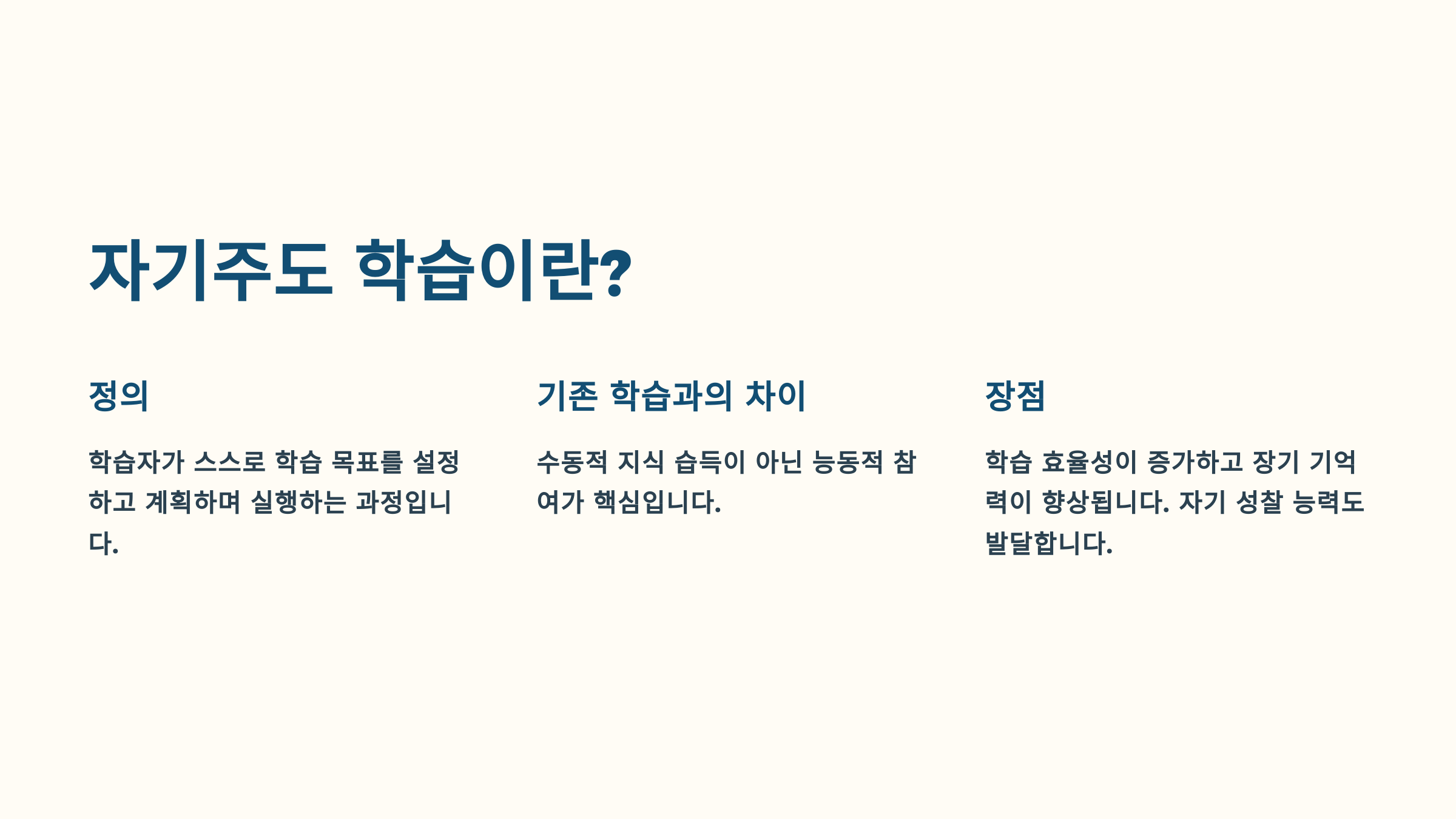 자기주도 학습은 학생이 스스로 학습 목표를 설정하고, 계획을 수립한 후, 이를 실천하고 점검하는 학습 방식이에요. 단순히 교사의 지도만 따르는 것이 아니라 자신만의 학습 방법을 만들어가는 과정이죠.