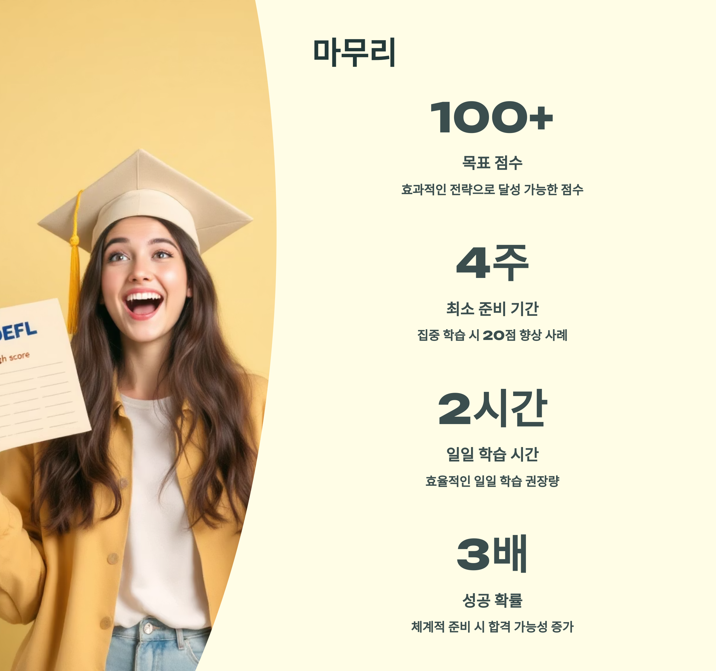 TOEFL은 집중력 + 시간조절 능력을 동시에 테스트하는 시험이에요. 긴장되더라도 전체 흐름을 머리에 그리고, 어디서 여유를 만들 수 있는지 미리 연습해두세요!