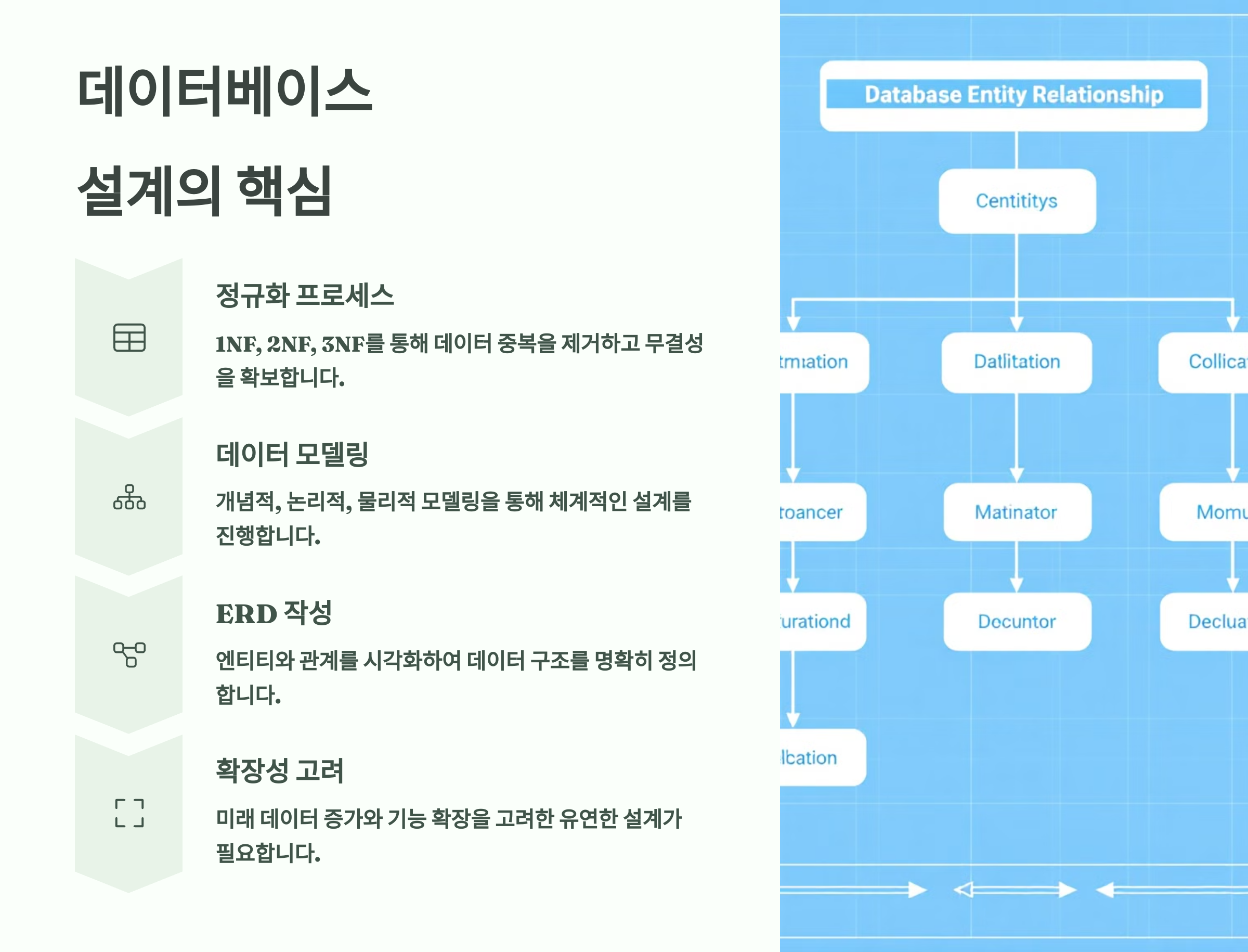 💡 데이터베이스 설계는 마치 건축 설계와 같아요. 기초가 튼튼해야 그 위에 멋진 건물(서비스)을 지을 수 있거든요. 좋은 설계는 개발과 유지보수를 훨씬 쉽게 만들어줘요!