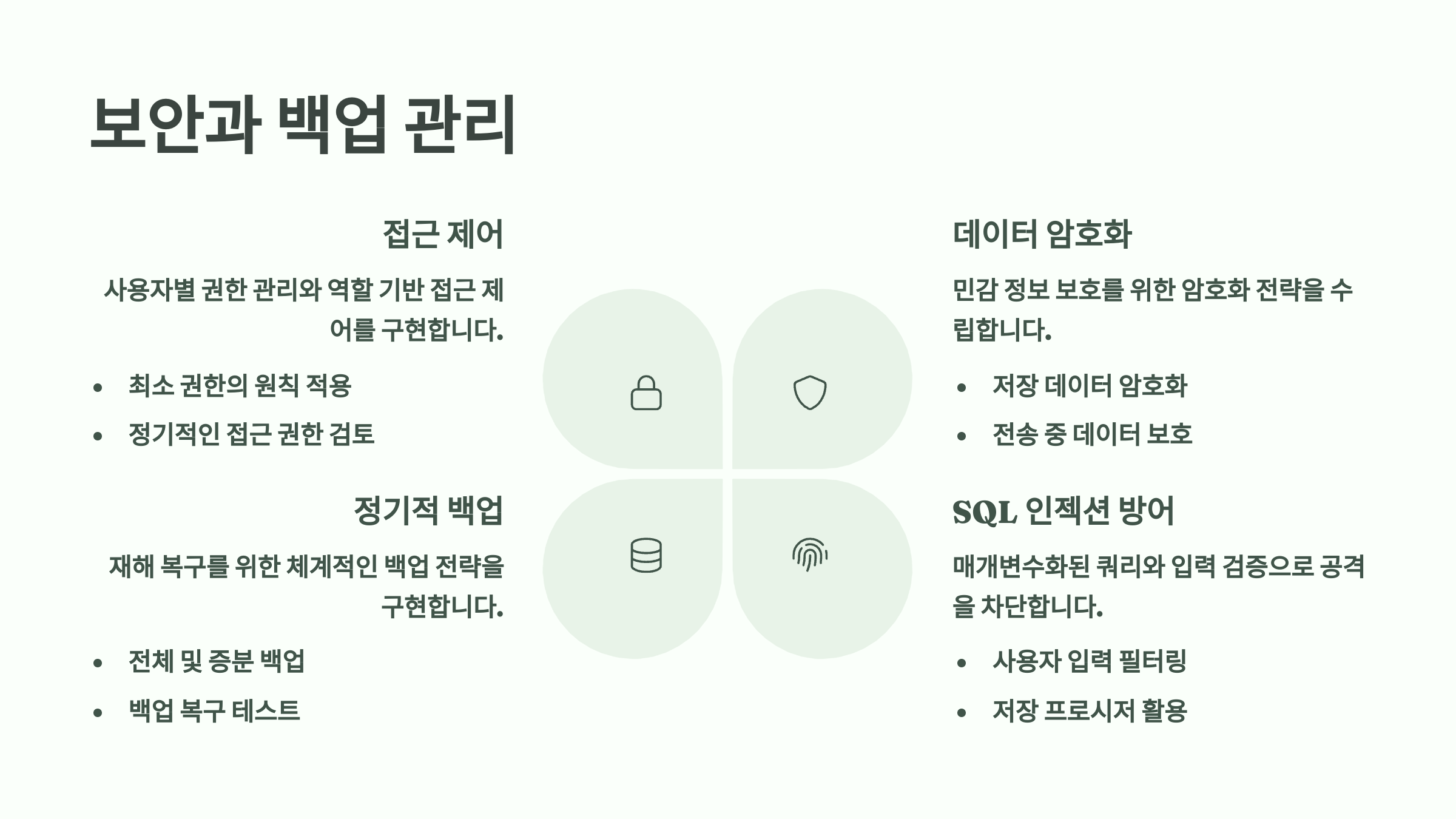 🔍 데이터베이스 보안은 단순히 기술적인 접근이 아니라 ‘위험을 예측하고 대비하는 사고방식’이에요. 늘 최악의 상황을 상정하고, 그에 맞는 시스템을 미리 준비해두는 게 중요하답니다!