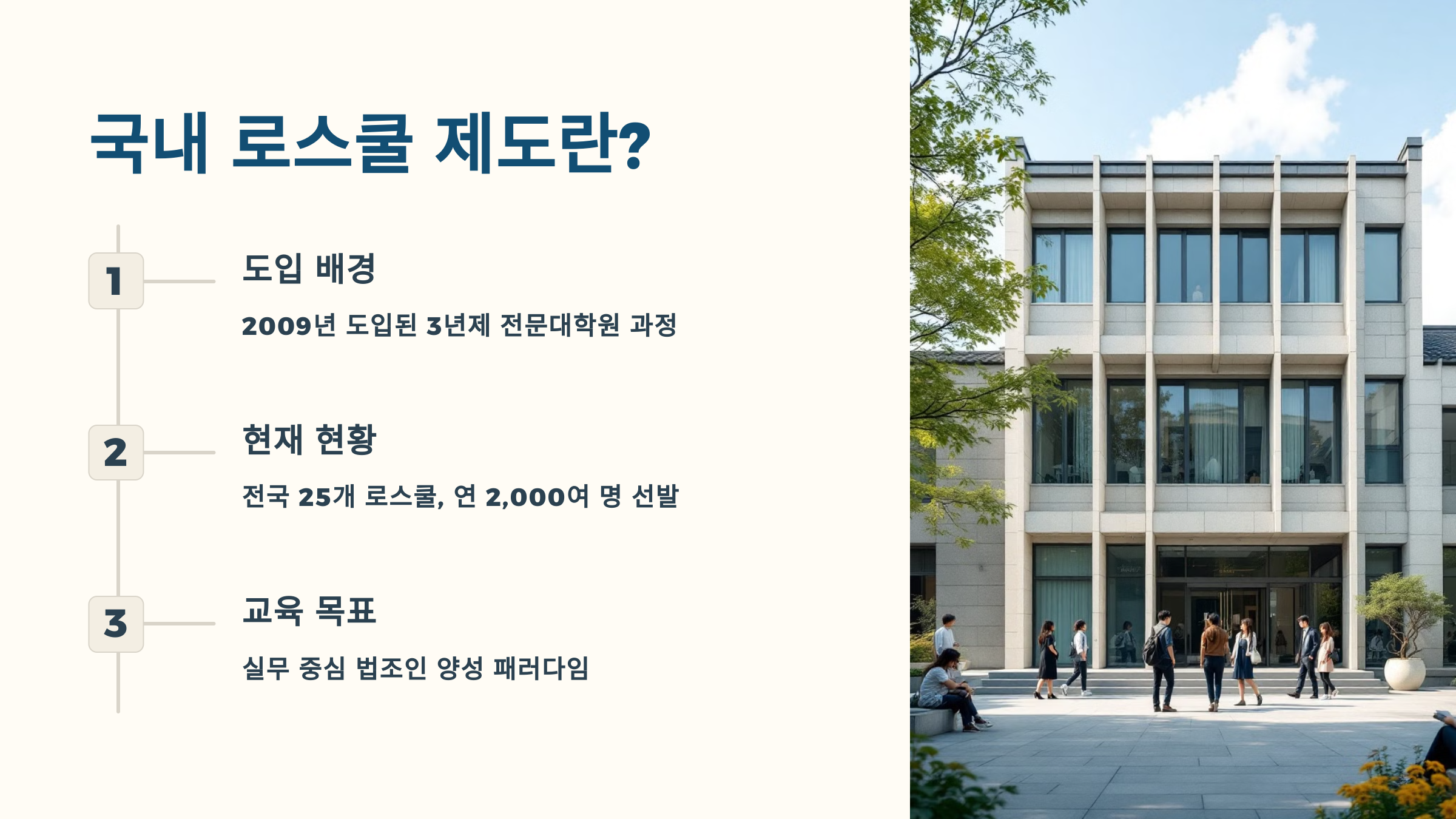 이 제도는 미국의 로스쿨 시스템을 모델로 삼아, 학문과 실무를 통합한 통합형 법률 교육을 지향하고 있어요. 학문 중심의 선발 시험에서 벗어나, 전반적인 역량과 자질을 평가하는 입학 시스템으로 전환된 것이 가장 큰 변화 포인트죠.