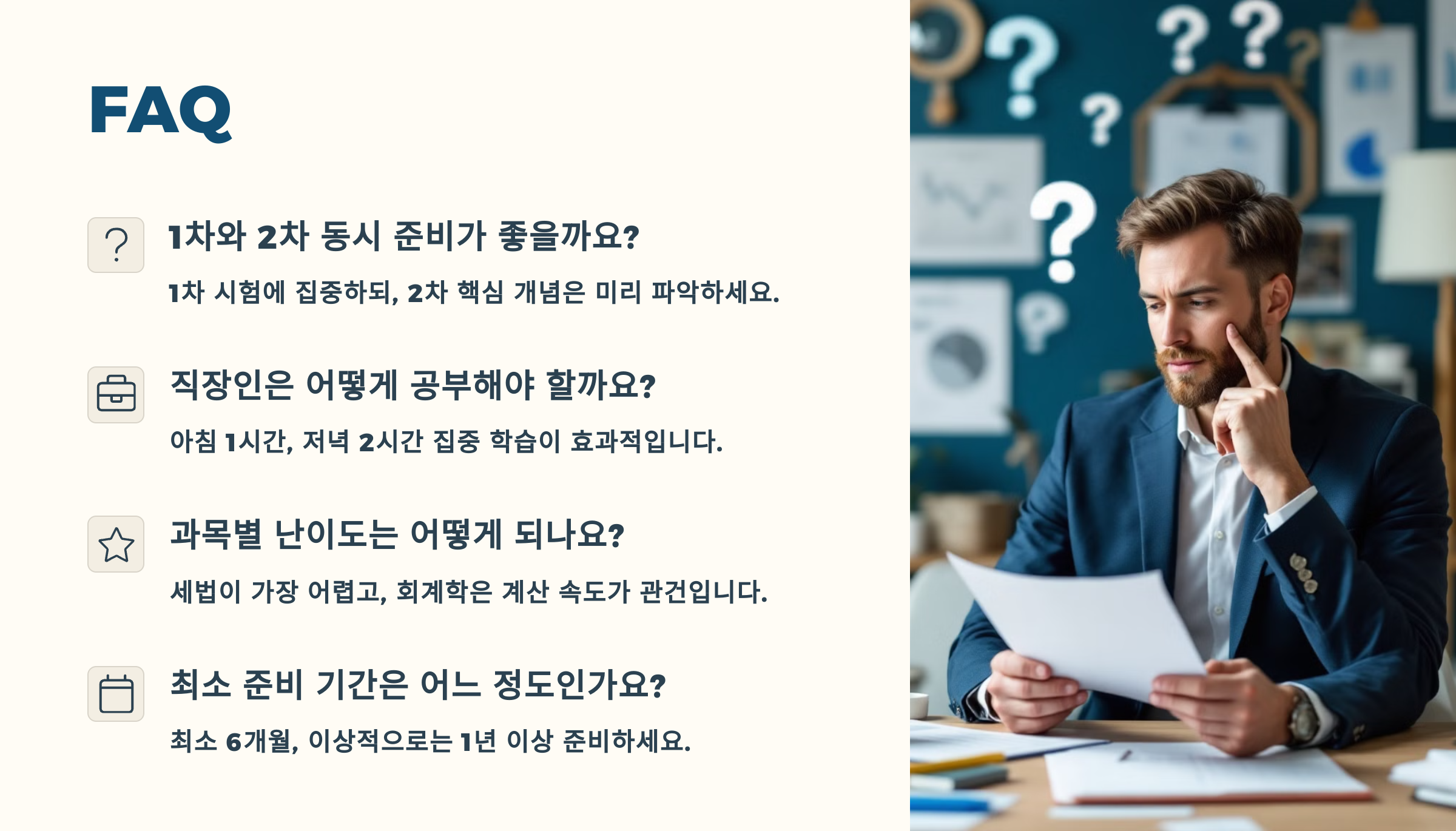 A1. 전업 수험생 기준으로 보통 6개월~1년 정도 걸려요. 회계와 법률 병행 시엔 최소 9개월 이상은 계획하는 게 안정적이에요. 😊