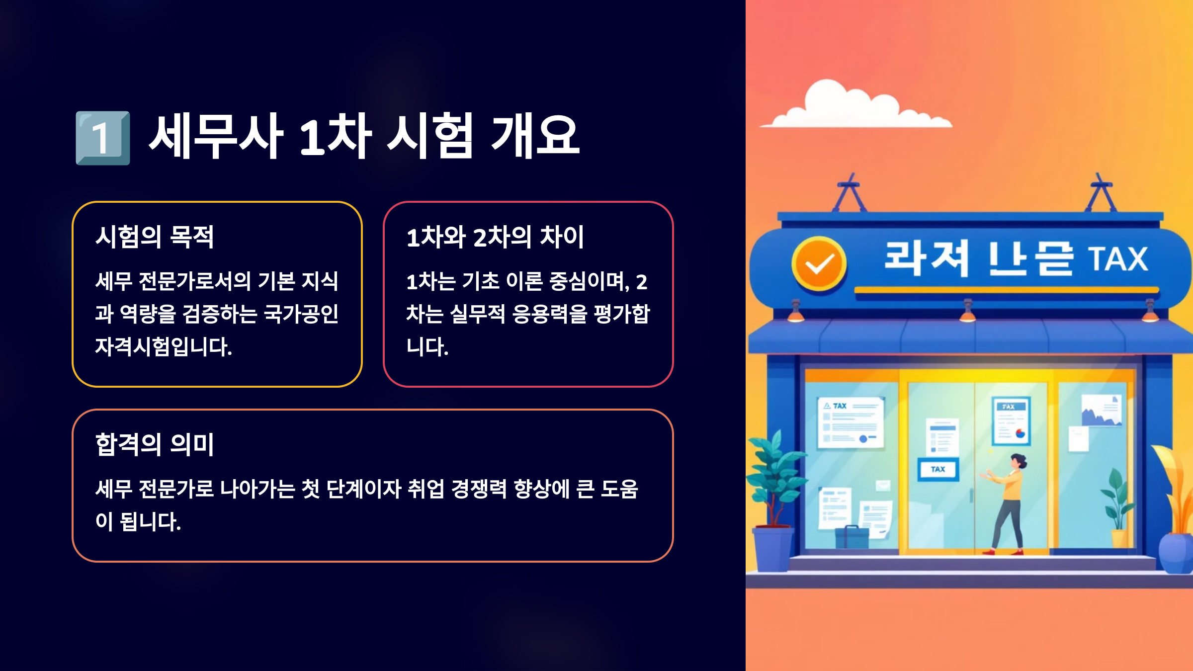 📌 세무사 시험은 1차(객관식)와 2차(논술형)으로 구성되며, 1차 시험에서는 회계학과 세법의 기초 개념이 중요한 역할을 해요. 특히 1차 시험은 과락(40점 미만) 없이 평균 60점 이상을 받아야 합격할 수 있어요. 🎓