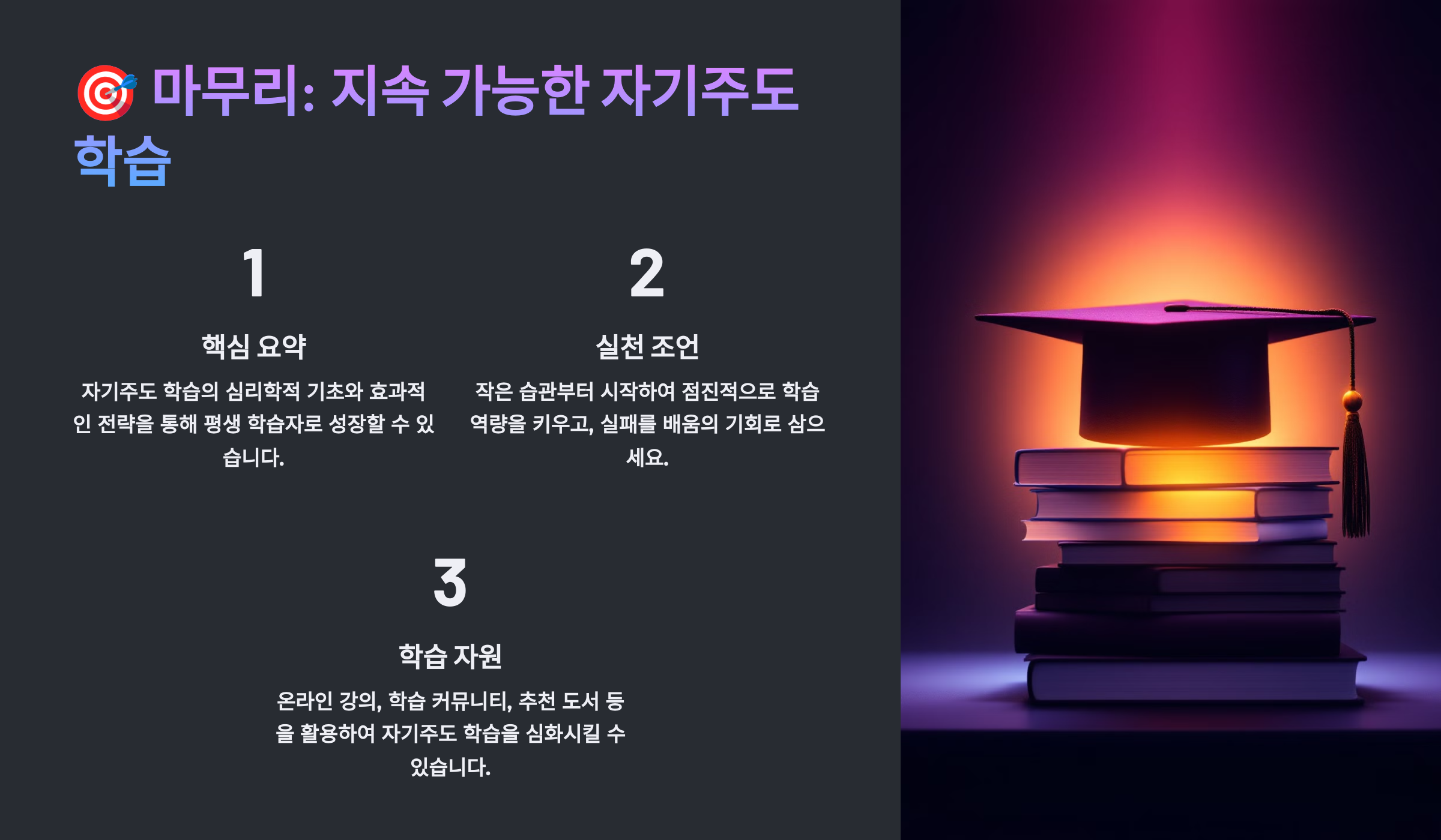 🎓 자기주도 학습은 단순히 공부하는 것이 아니라 스스로 성장하는 과정이에요. 목표를 설정하고, 계획을 세우고, 꾸준히 실천하는 것이 가장 중요하죠.