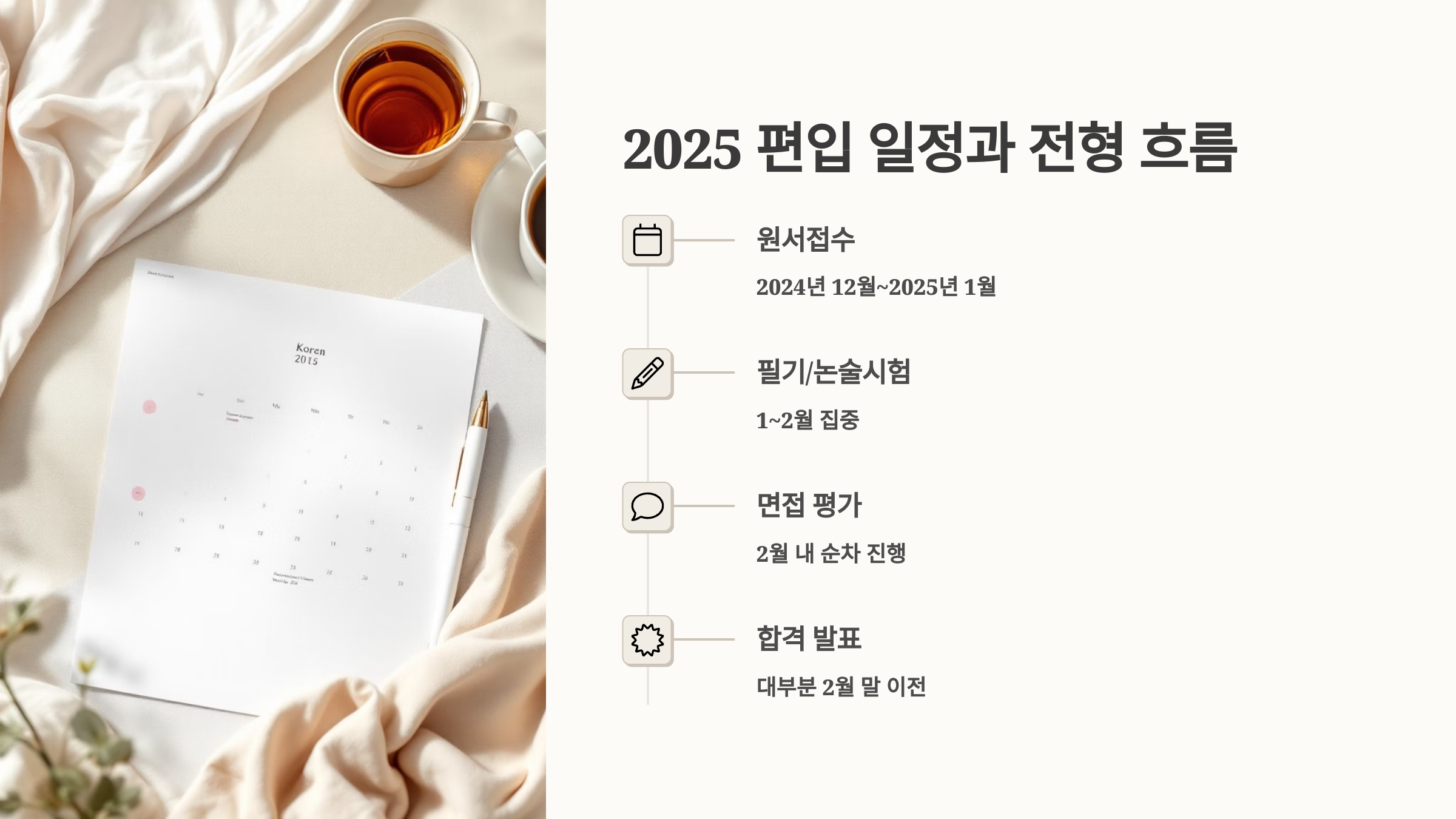 이제 다음은 세 번째 섹션 📅 2025 편입 일정과 전형 흐름 준비 시기를 놓치지 않기 위해 타임라인부터 확실히 잡아야 해요! ⏰
