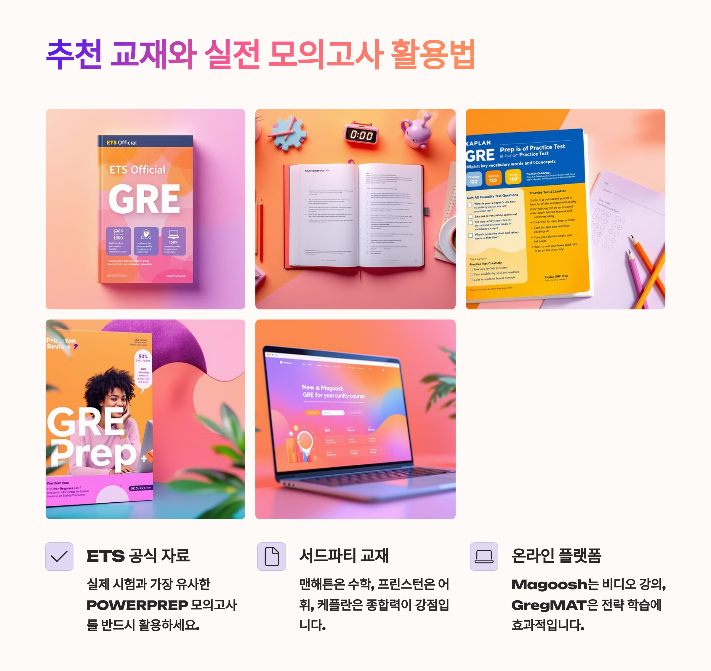 GRE 공부를 시작할 때 가장 먼저 필요한 건 믿을 수 있는 교재예요. 아무리 열심히 공부해도 방향이 잘못되면 효과가 떨어지기 때문에, 검증된 자료로 효율적인 학습을 해야 해요. 그중에서도 가장 기본이 되는 교재는 바로 ETS 공식 교재예요. 🎓