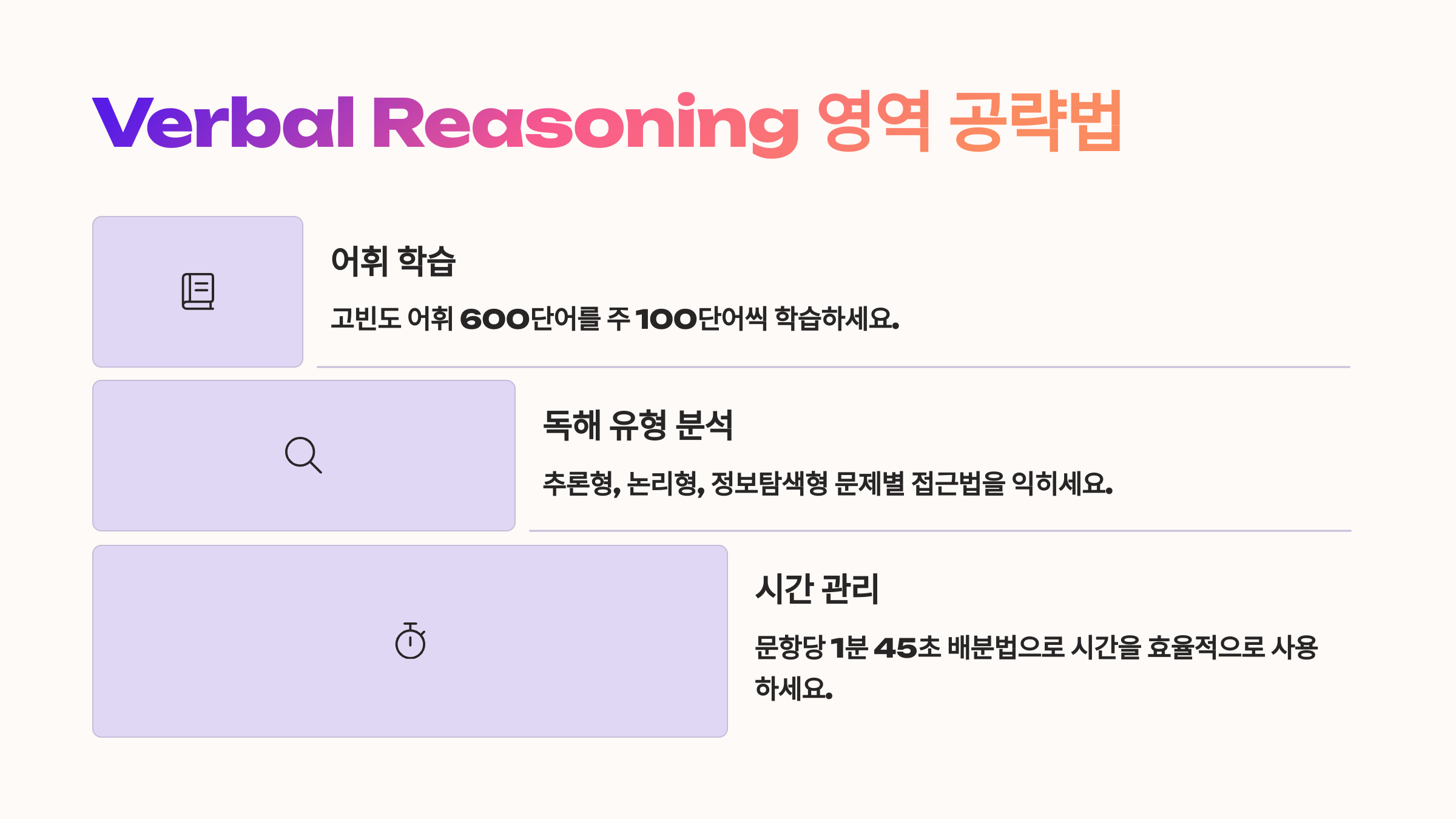 마지막으로, 모의고사를 활용해 실전 감각을 익히는 것이 Verbal 실력 향상에 큰 도움이 돼요. 특히 시간 맞춰서 풀기, 실전과 동일한 환경 조성하기를 습관화하면 실전에서도 긴장하지 않고 자신 있게 문제를 풀 수 있어요. 지금까지 Verbal 전략을 봤다면, 이제 수학 영역인 Quantitative로 넘어가 볼까요? 😎