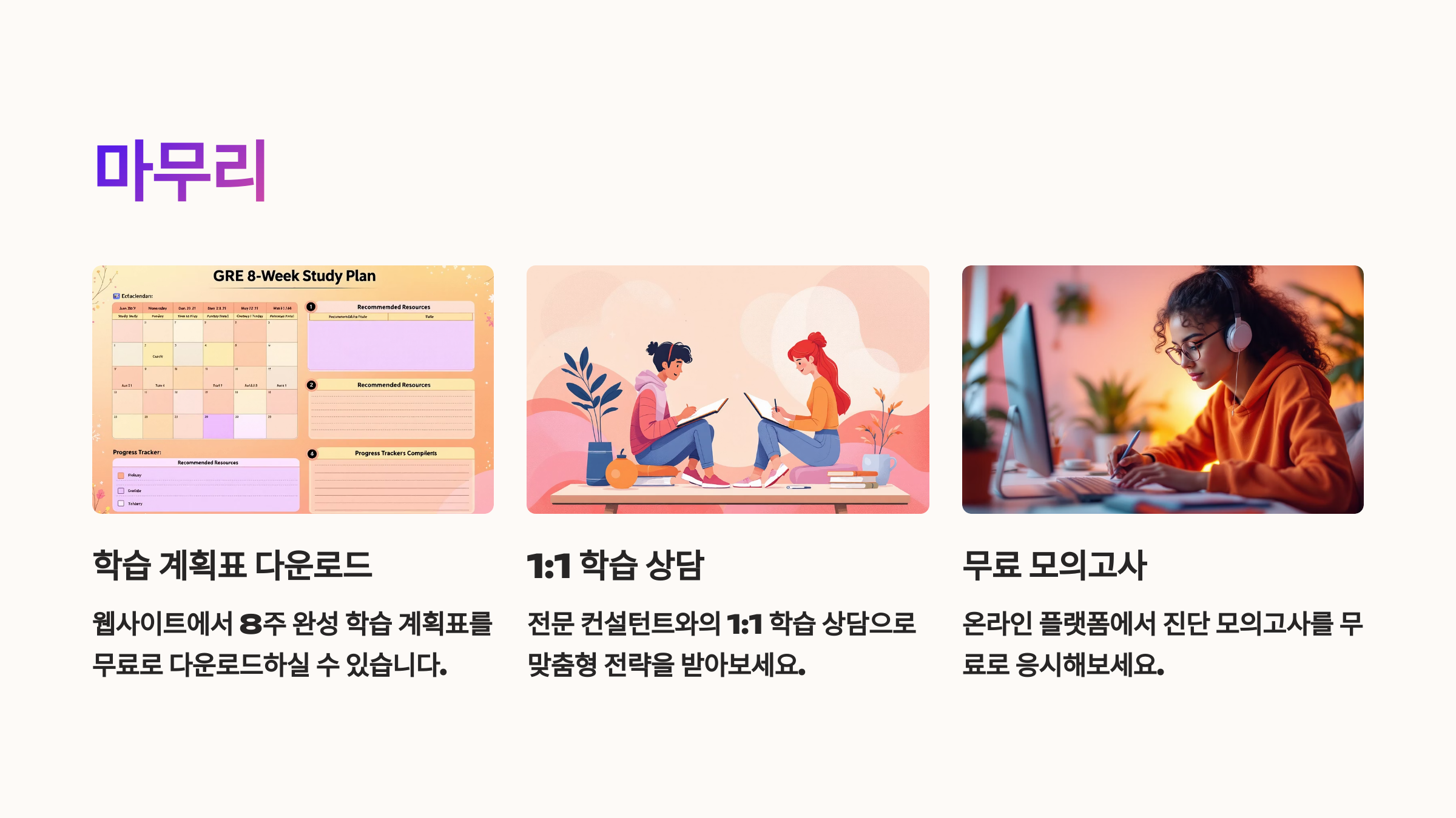 그동안 GRE를 준비하면서 어려움이 많았을 수 있어요. 특히 영어가 모국어가 아닌 분들에게는 Verbal이나 Writing에서 스트레스를 받을 수 있지만, 하나하나 쌓아가는 경험이 결국 실력을 만들어줘요. 이 길을 먼저 걸었던 수험생들이 증명했어요. 💬