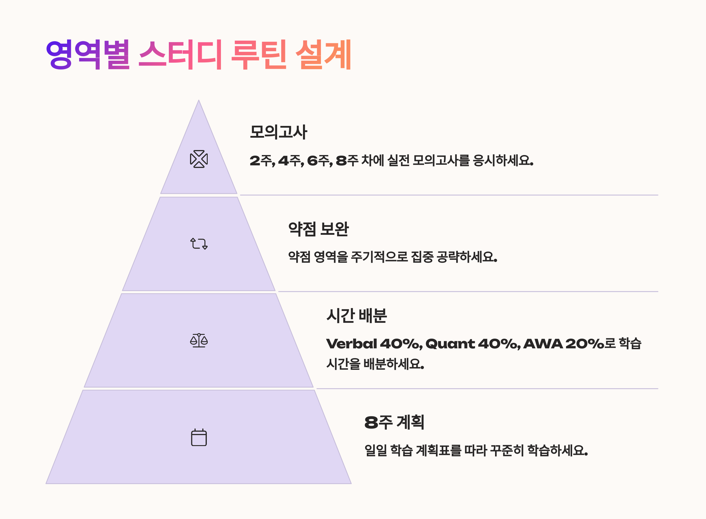 월요일~금요일까지 각 요일마다 한 영역에 집중하는 ‘집중형 루틴’도 추천해요. 예를 들어 월요일은 Verbal 집중, 화요일은 Quant 집중, 수요일은 Writing 중심으로 하루에 하나의 영역에 몰입하는 방식이에요. 피로도가 낮고 몰입도가 높아지는 장점이 있어요.