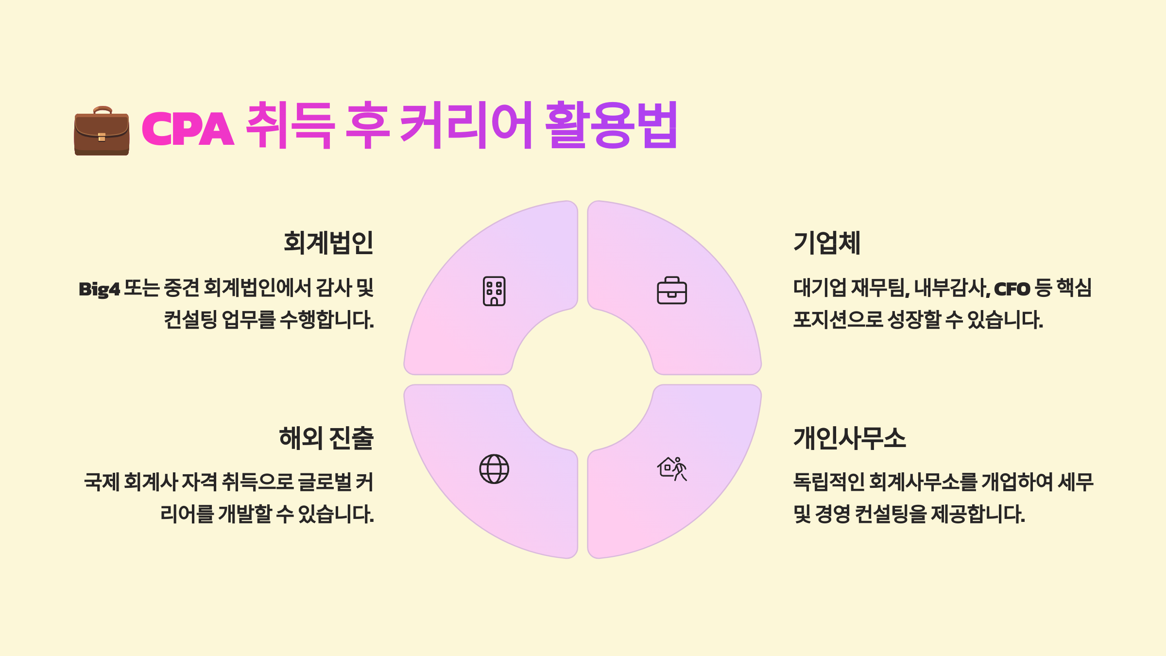 📌 다음 섹션은 “💼 CPA 취득 후 커리어 활용법”이에요. 합격 후 어떤 길이 열리는지, 실제 취업과 연봉 정보를 소개해드릴게요!