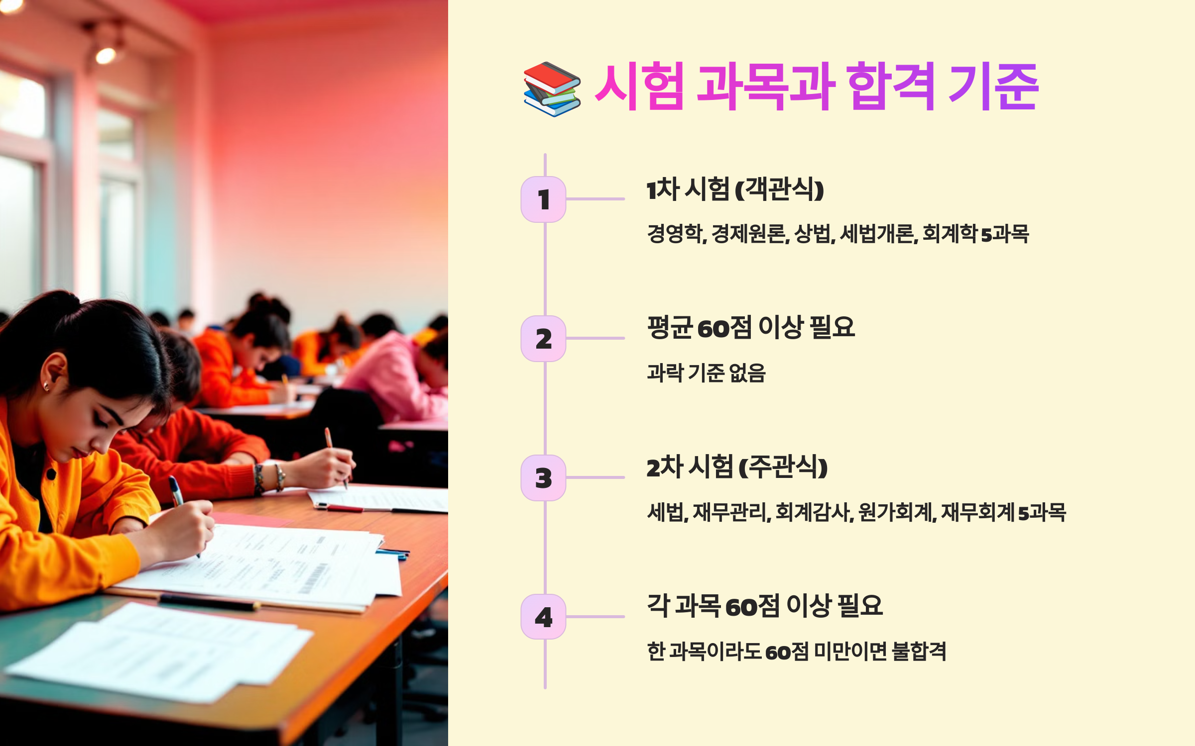 📌 다음은 “📚 시험 과목과 합격 기준”이에요. 1차/2차 시험이 어떻게 구성돼 있고, 몇 점 이상 받아야 합격인지 정확히 안내해드릴게요!