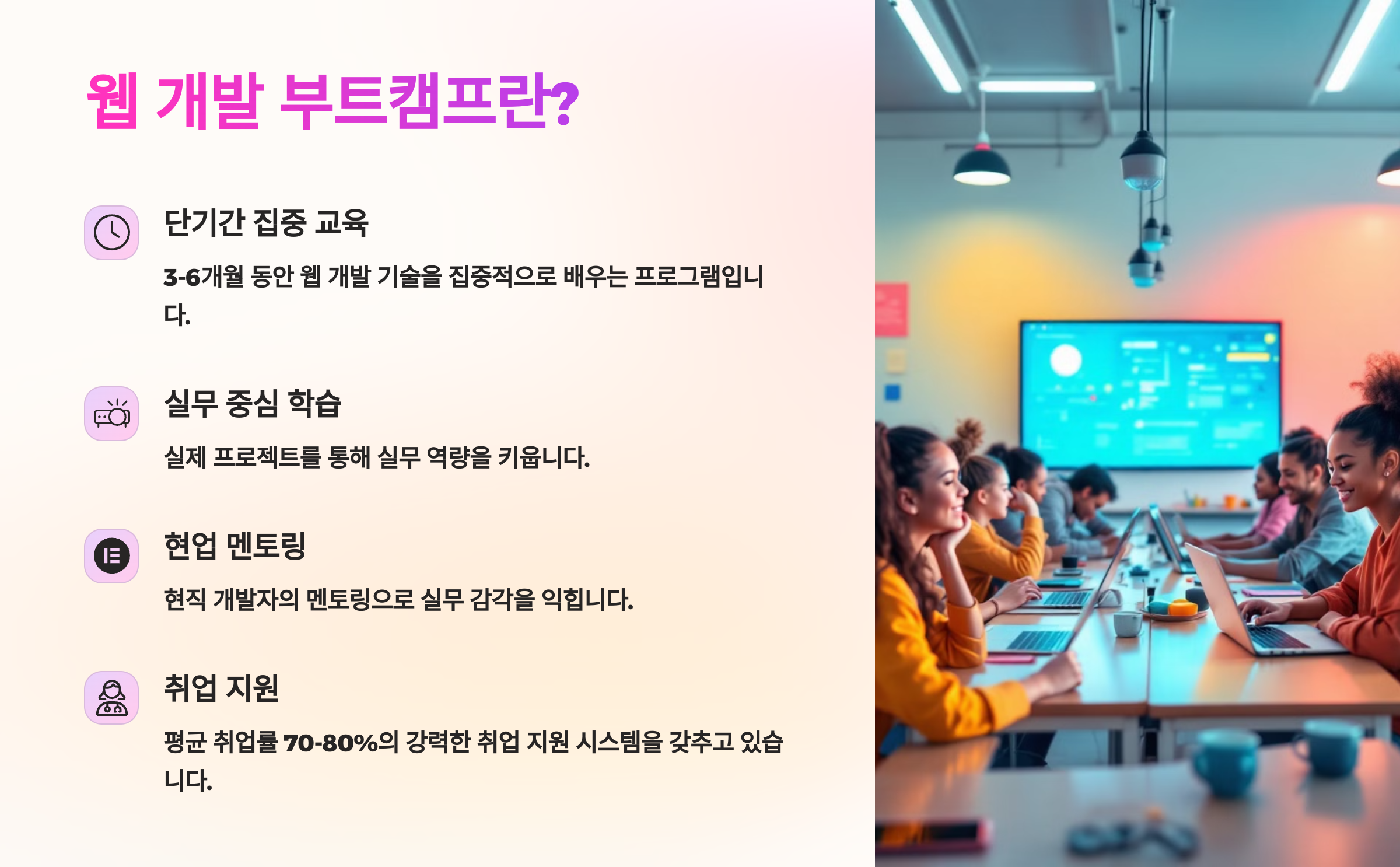 간단히 말해 부트캠프는 개발자 전향의 고속도로 같은 개념이에요. 비전공자도 커리어를 바꾸기 위해 이수하는 경우가 많고, 최근엔 AI·데이터 부트캠프까지 함께 운영되는 곳도 많아졌어요. 💥