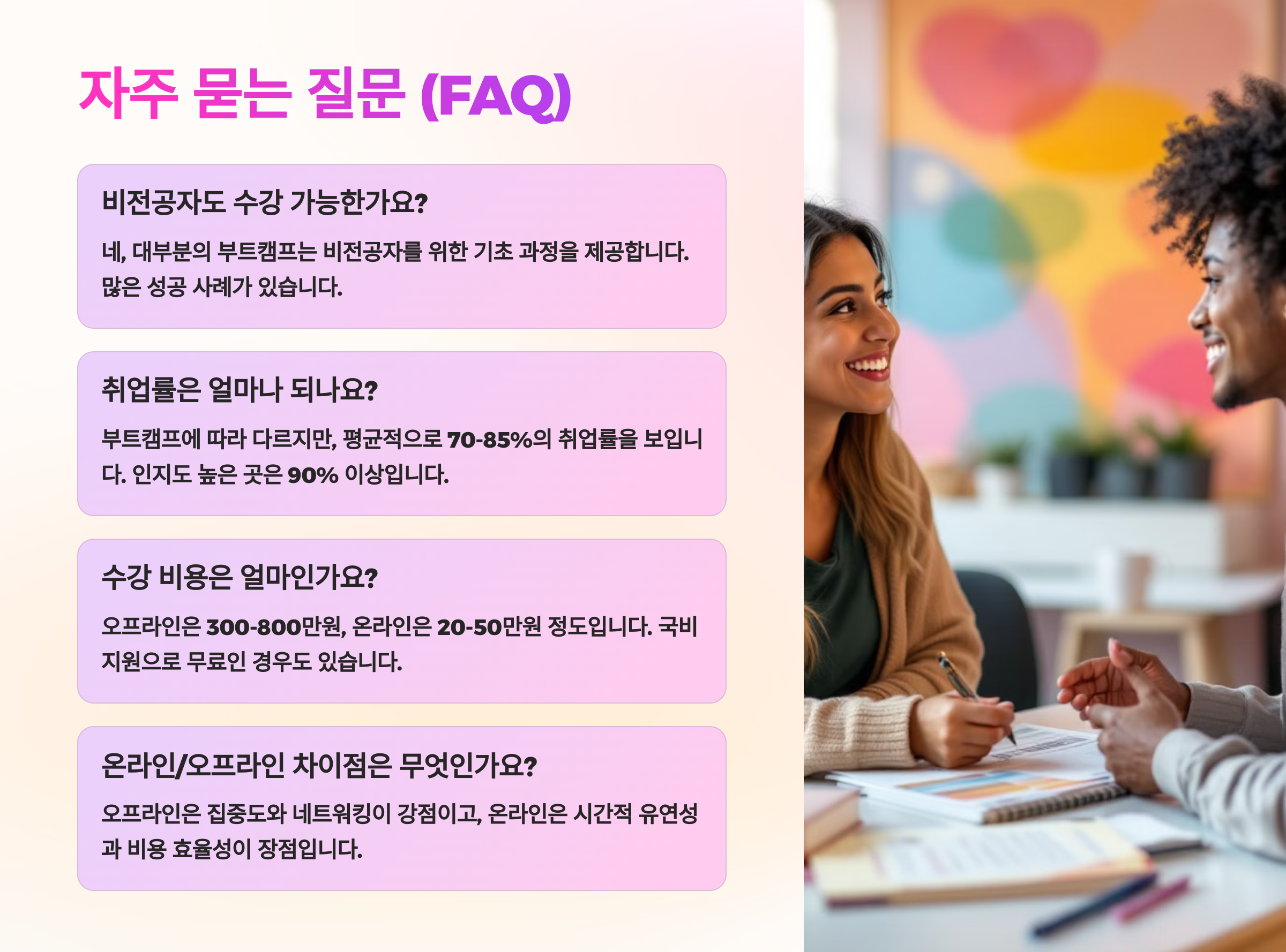 이제 다음 섹션은 ❓ 자주 묻는 질문(FAQ)이에요! 웹 개발 부트캠프 관련해서 실제로 사람들이 많이 묻는 궁금증 8가지, 바로 정리해드릴게요! 🧠💬