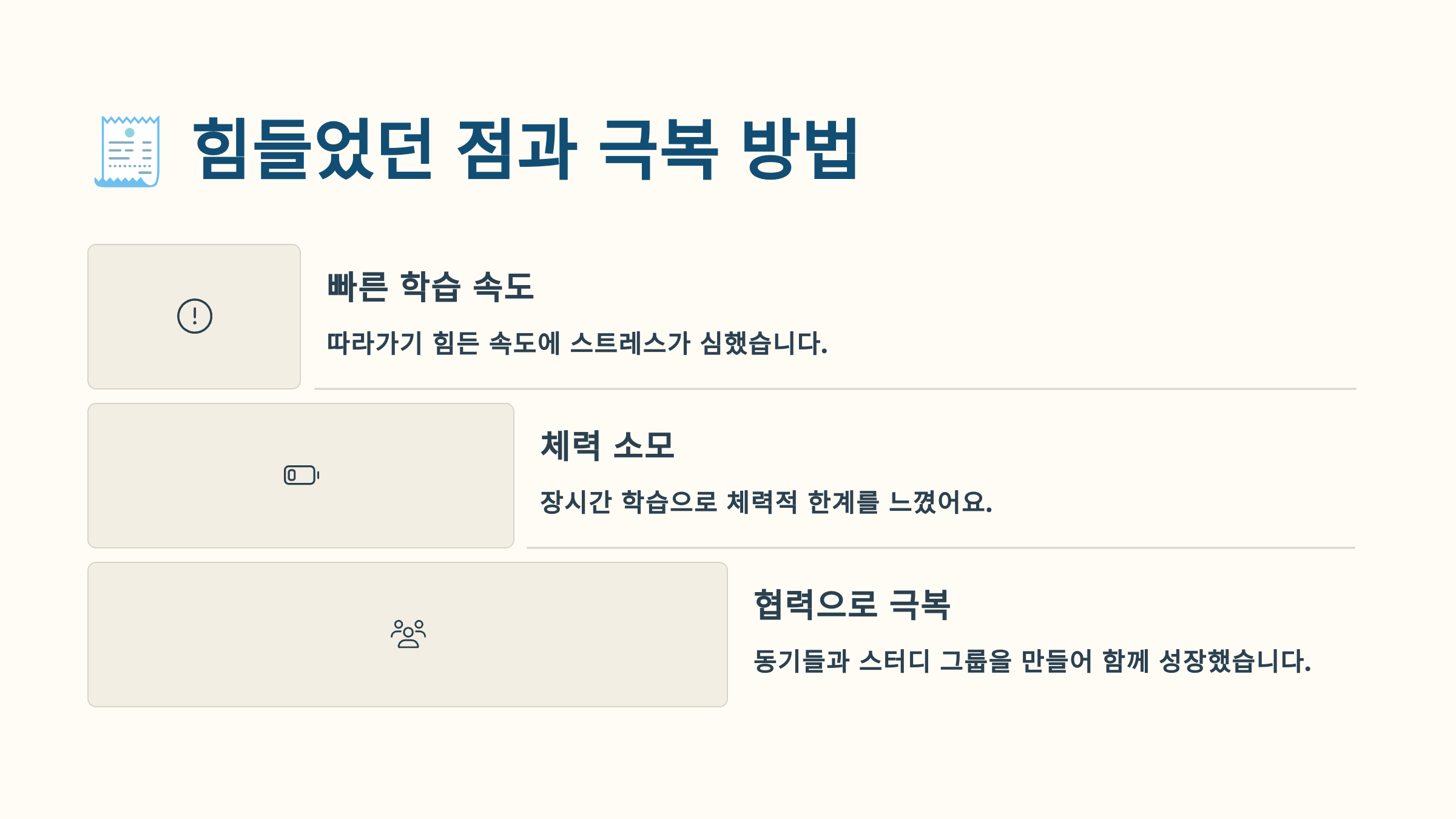 😓 부트캠프 수료자들이 입을 모아 말하는 공통점 하나. “진짜 빡셌다”예요. 하루 8시간 이상 몰입해서 코딩, 디자인, 리서치를 하다 보면 체력, 멘탈, 동기부여까지 흔들릴 때가 많았대요. 하지만 다들 각자의 방식으로 극복해냈어요. 그 얘기, 지금 해줄게요.