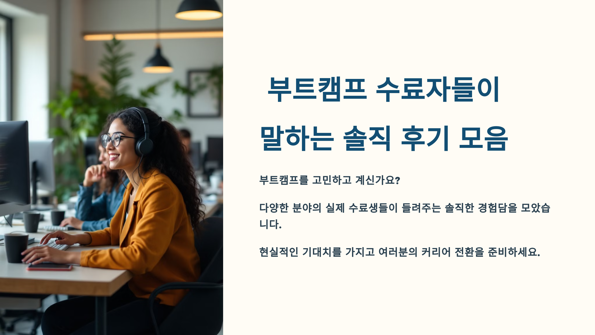💡 부트캠프는 단순한 교육 프로그램이 아니라, 인생을 바꾸는 여정이에요. 오늘 소개한 후기들은 모두 수료자들이 직접 겪은 진짜 경험이었어요. 힘든 순간도 있었지만, 결국 포기하지 않고 끝까지 버텨낸 사람들이 새로운 커리어를 얻었죠.