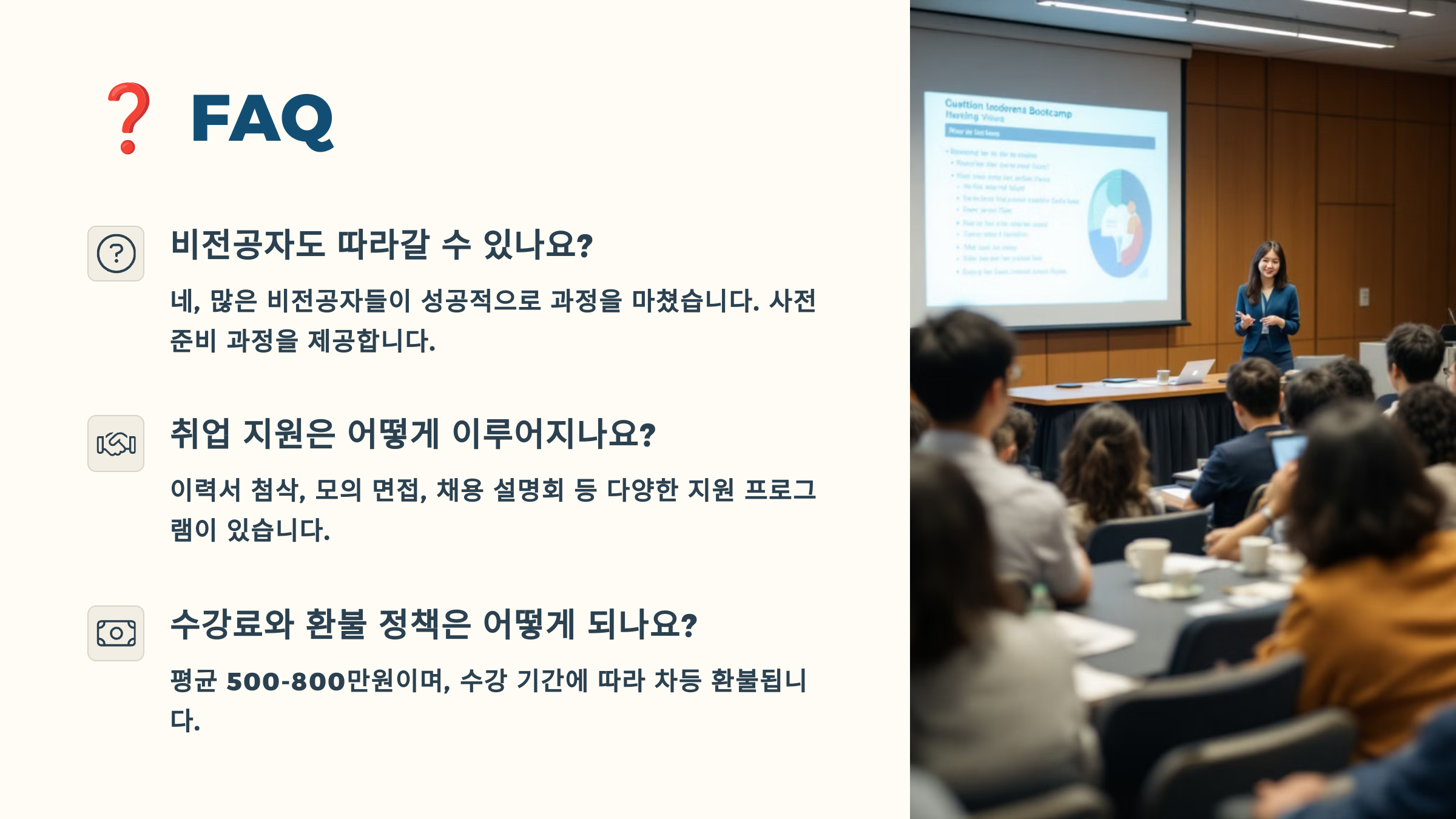 💬 대부분 수료자들은 “포기 안 한 게 취업 성공의 비결”이라고 말해요. 부트캠프가 마법을 부리는 건 아니지만, 제대로 이수하고 준비하면 정말 인생을 바꿔놓는 도구가 될 수 있다는 거죠!
