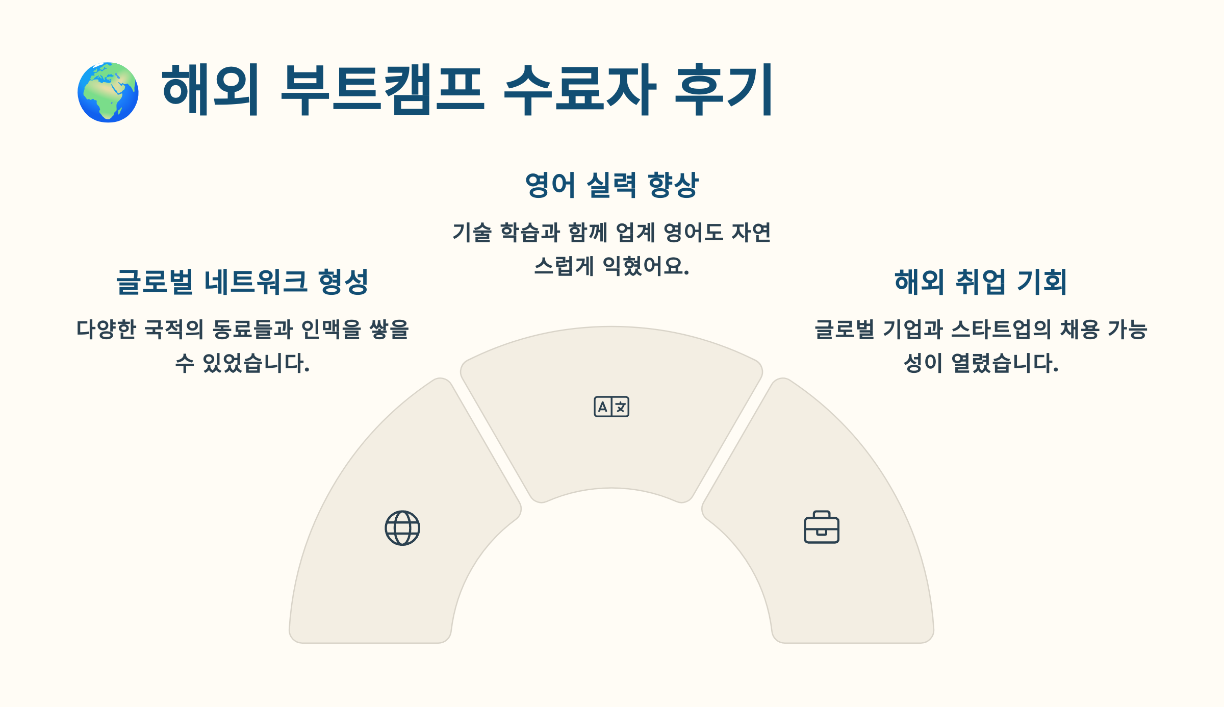 🌍 해외 부트캠프는 전 세계 수강생들과 함께 배우며 영어로 진행돼요. 리뷰를 보면 “실력뿐 아니라 글로벌 커뮤니케이션 능력까지 같이 올랐다”는 이야기가 많아요. 특히 실리콘밸리 기반 커리큘럼과 멘토링 시스템에 대한 만족도가 높죠!