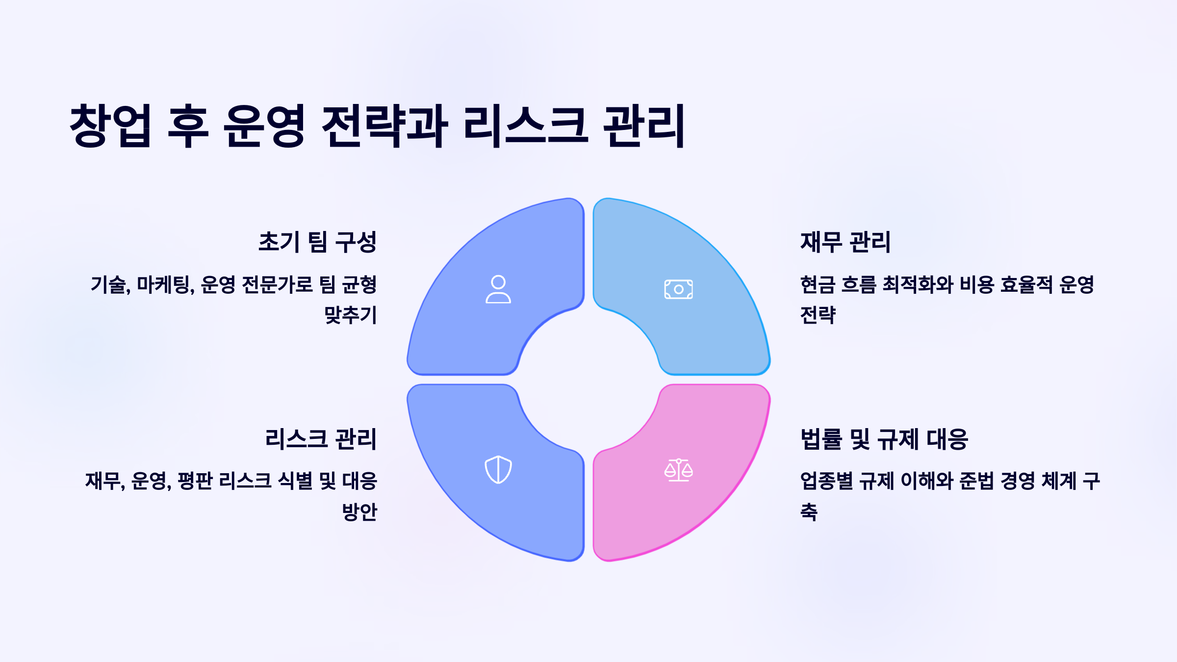 🛠️ 창업은 시작보다 운영이 더 어려워요. 제품을 만들고 시장에 내놓는 건 절반의 성공일 뿐이고, 이후의 운영 전략, 조직 구성, 리스크 대응이 사업의 생존을 결정해요. 특히 자금 흐름 관리와 KPI 모니터링은 스타트업 운영의 핵심이죠.