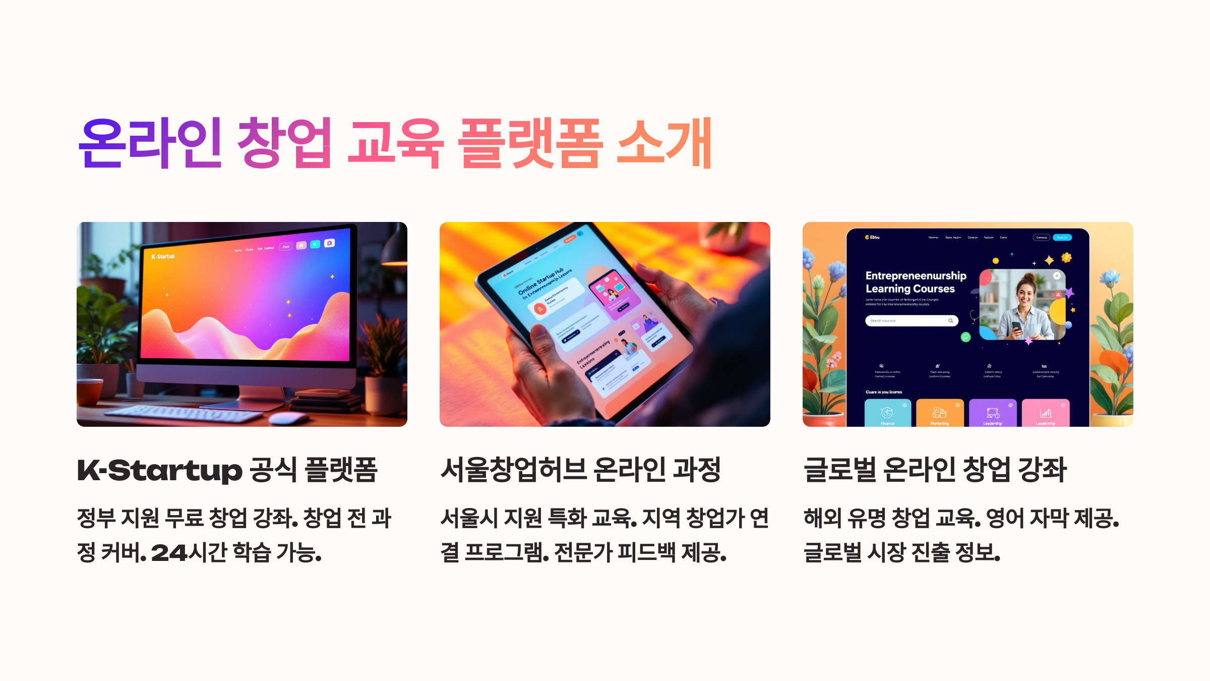 이제 다음은 👉 💻 온라인 창업 교육 플랫폼 소개예요! 무료부터 유료까지, 창업 지식 얻을 수 있는 꿀사이트 소개해드릴게요! 🧑‍💻🌐