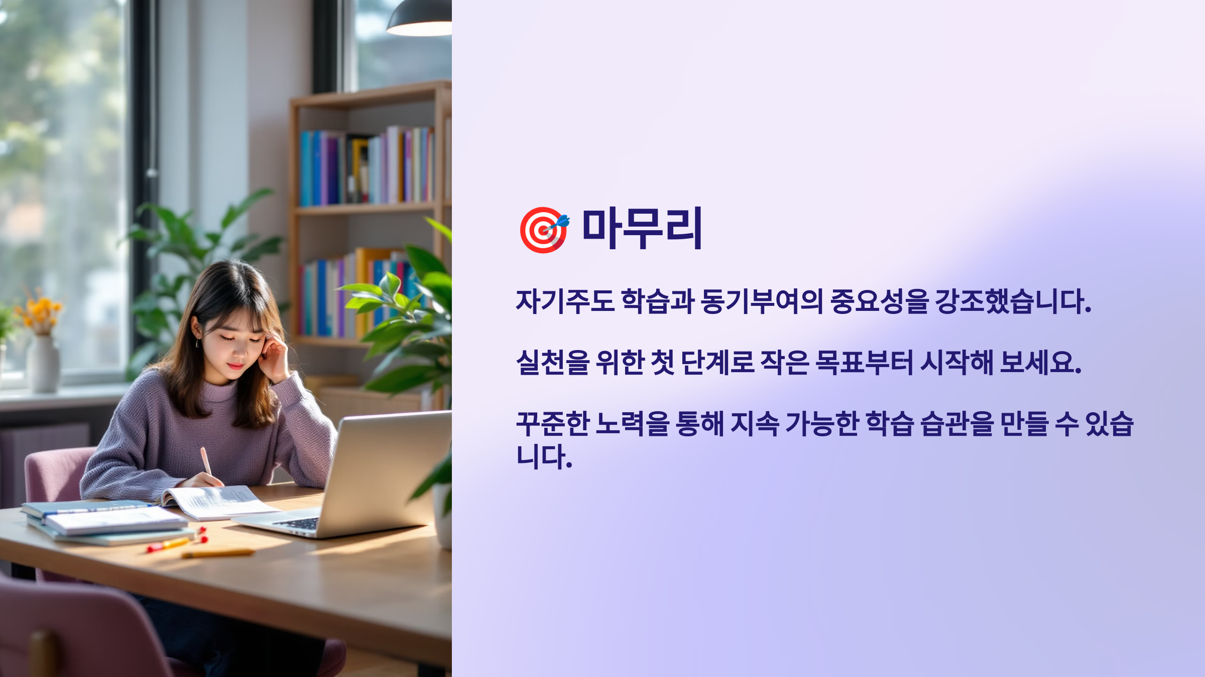 🧠 자기주도 학습을 하려면 단순히 공부 계획을 세우는 것만으로는 부족해요. 꾸준히 실천할 수 있는 힘, 즉 동기부여가 필수적이에요!
