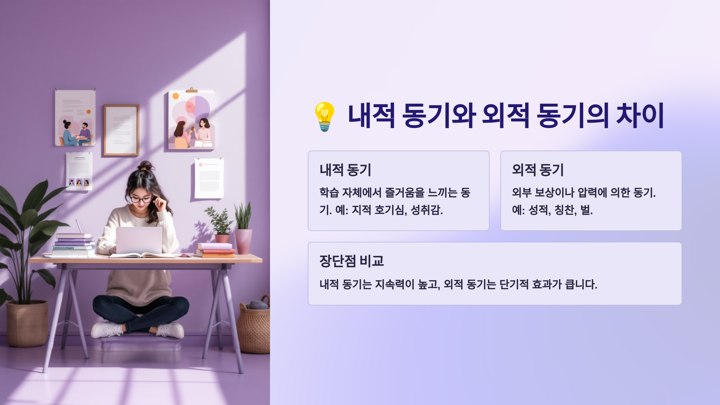 🔥 내적 동기는 학습 자체에서 즐거움을 찾고, 스스로 성장하는 데서 동기를 얻는 것이에요. 반면, 외적 동기는 보상, 성적, 경쟁 같은 외부 요인에 의해 동기부여되는 방식이에요.