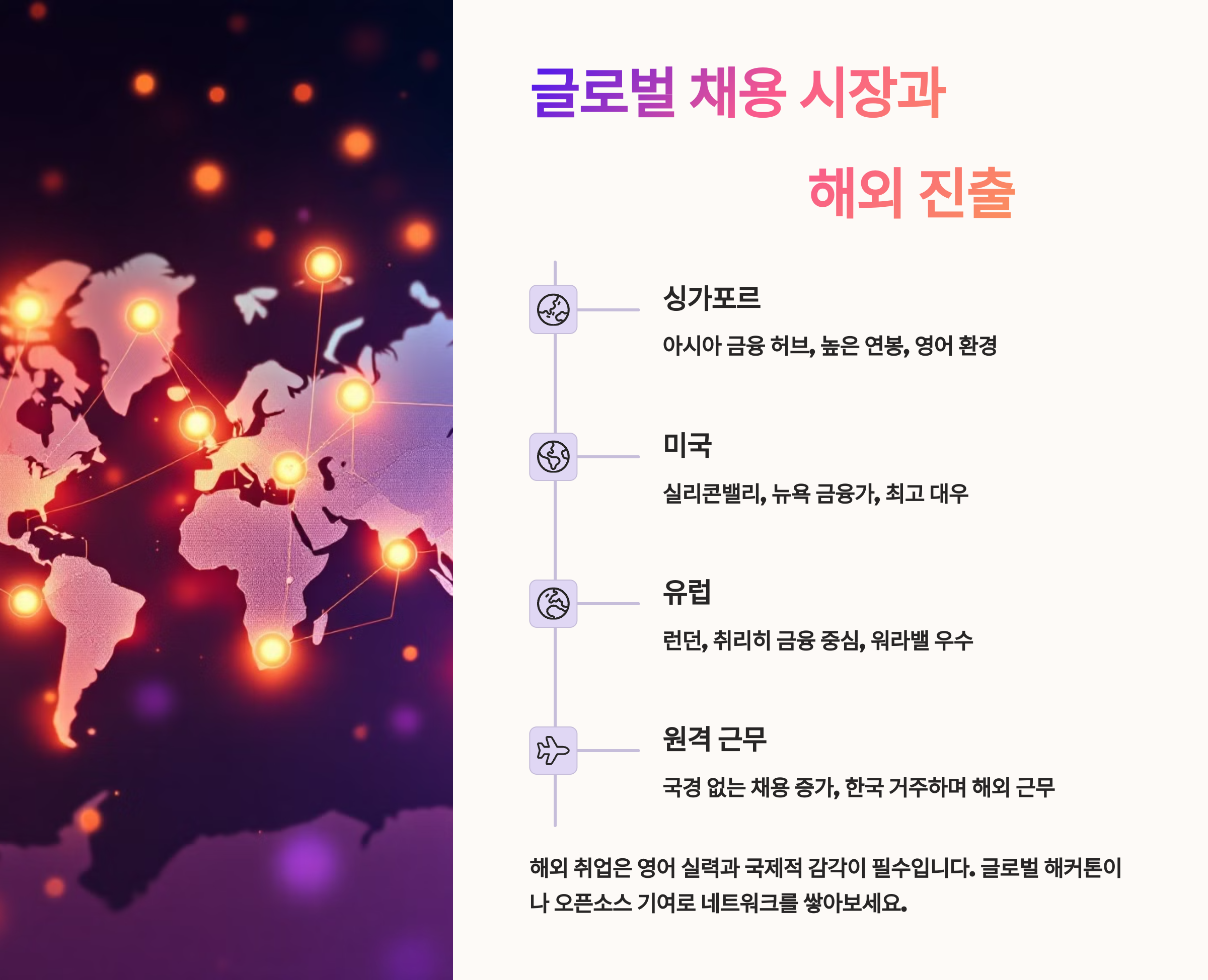 ✈️ AI 기술은 국경을 초월한 분야예요. 특히 미국, 캐나다, 유럽, 싱가포르 등은 AI 엔지니어에 대한 수요가 지속적으로 증가하고 있어요. 한국에서 경력을 쌓은 후 글로벌 진출을 꿈꾸는 분들이 많아지고 있죠.