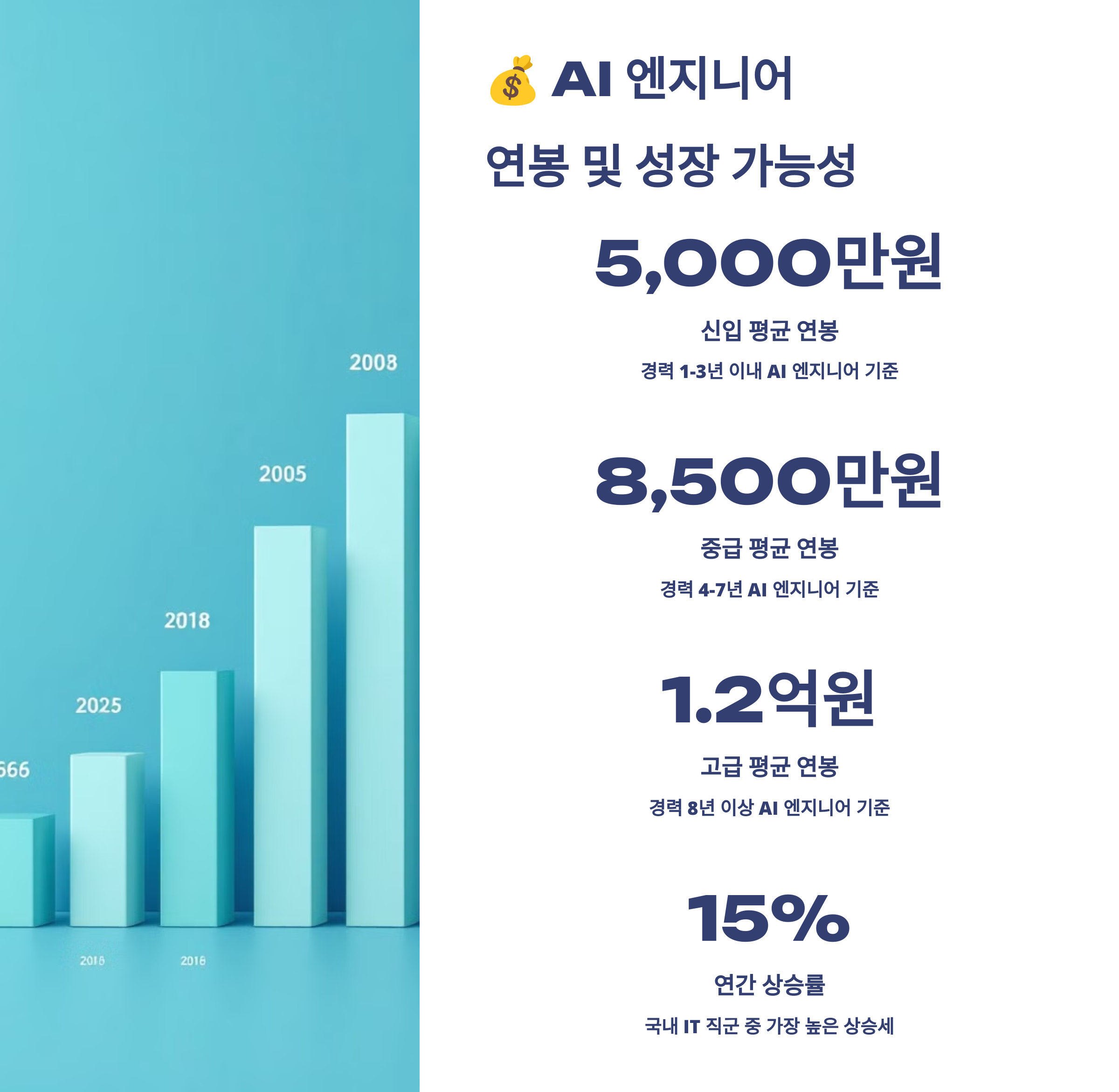 🚀 AI 시장은 매년 20% 이상 성장하고 있어요. 앞으로도 AI 엔지니어의 연봉과 수요는 계속 증가할 전망이에요!
