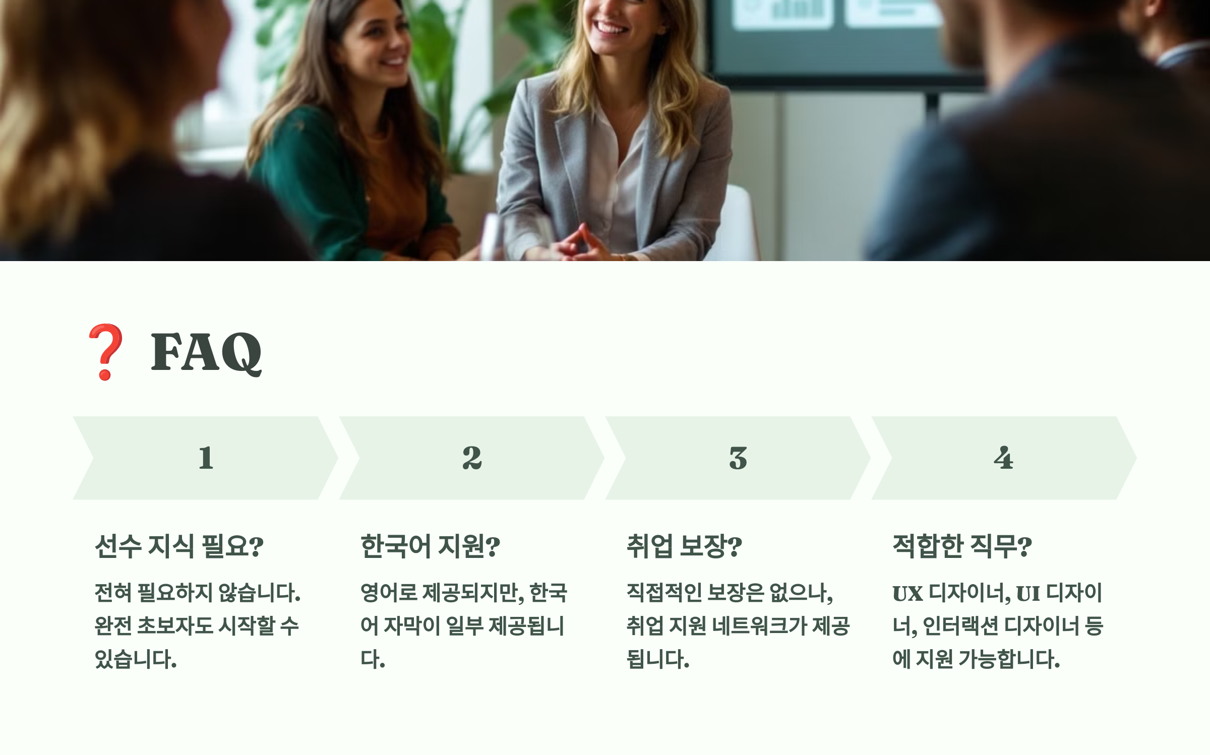 이제 일곱 번째 섹션 ❓ FAQ로 넘어갈게요! 수강 전 많이들 궁금해하시는 질문 8가지, 모두 정리해드릴게요! 💬🎯