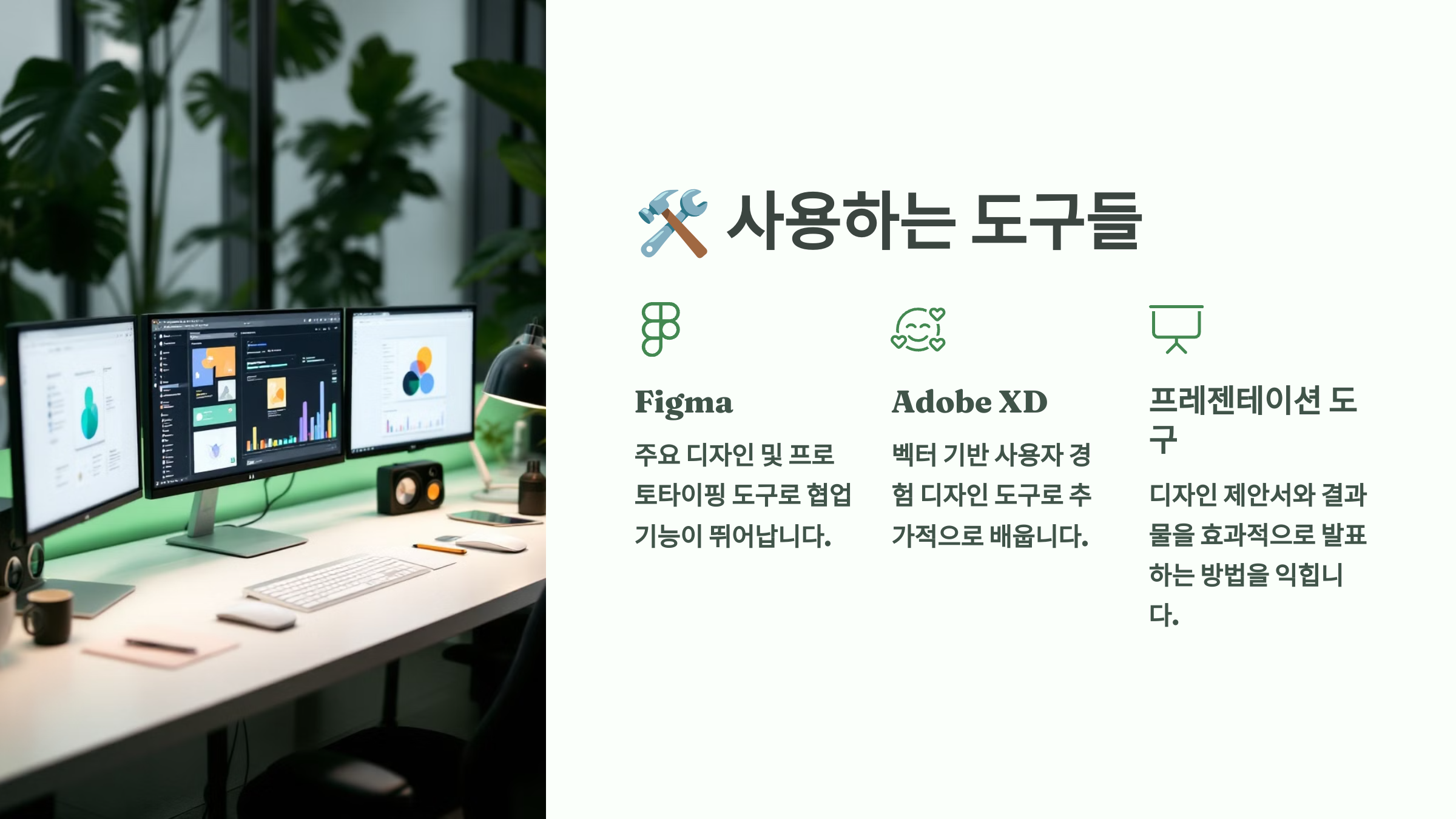 이제 세 번째 섹션 🛠️ 사용하는 도구들로 넘어갈게요! 과정에서 배우는 Figma, Adobe XD 등 실무 디자인 툴을 소개해드릴게요 🎨🧰