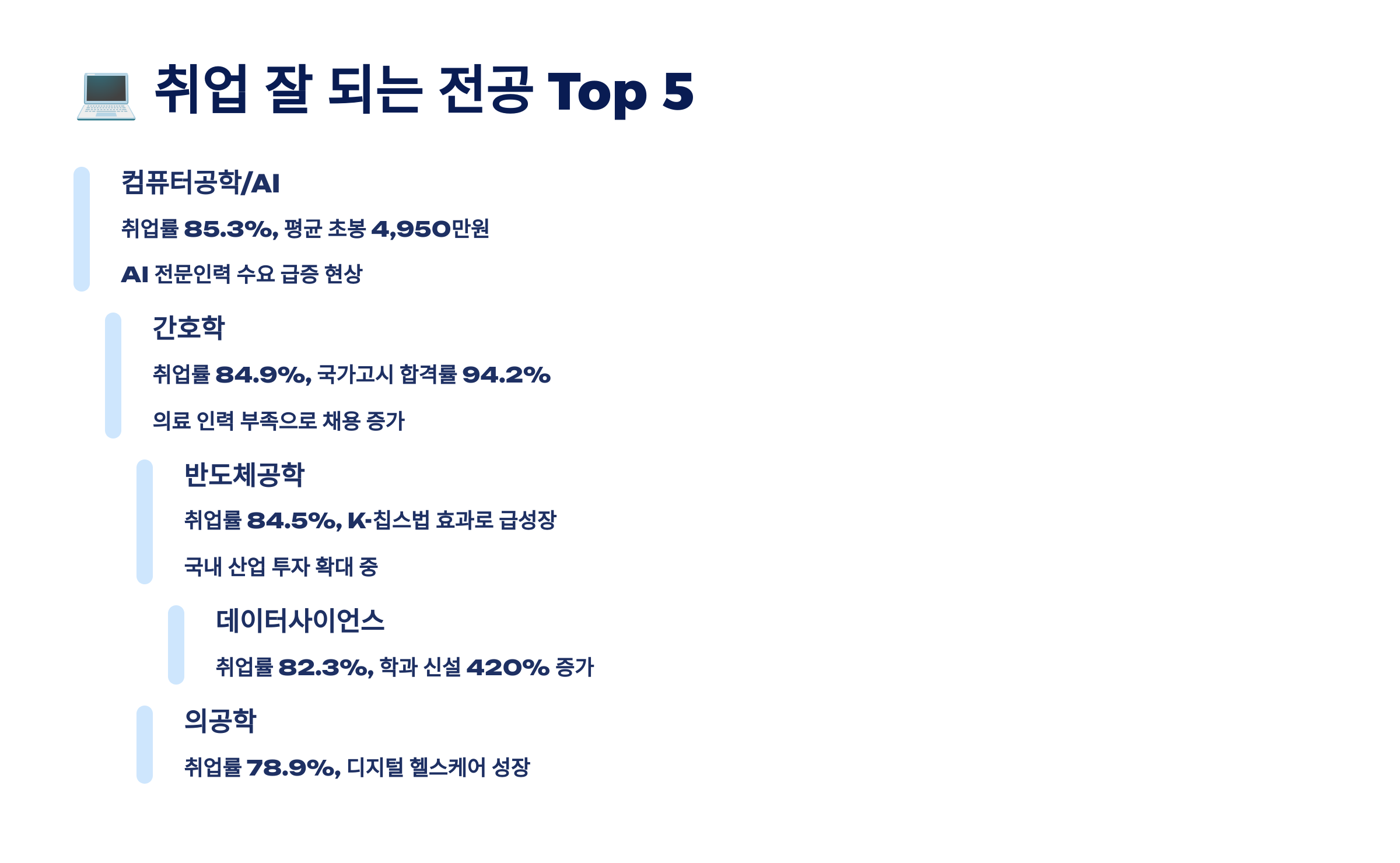이 전공들의 공통점은 산업 수요가 많고, 전공 전문성도 높다는 것이에요. 특히 의료, 반도체, IT, AI는 당분간 계속 인력난이 이어질 전망이에요. 즉, 취업시장에선 ‘팔리는 전공’인 셈이죠! 💡