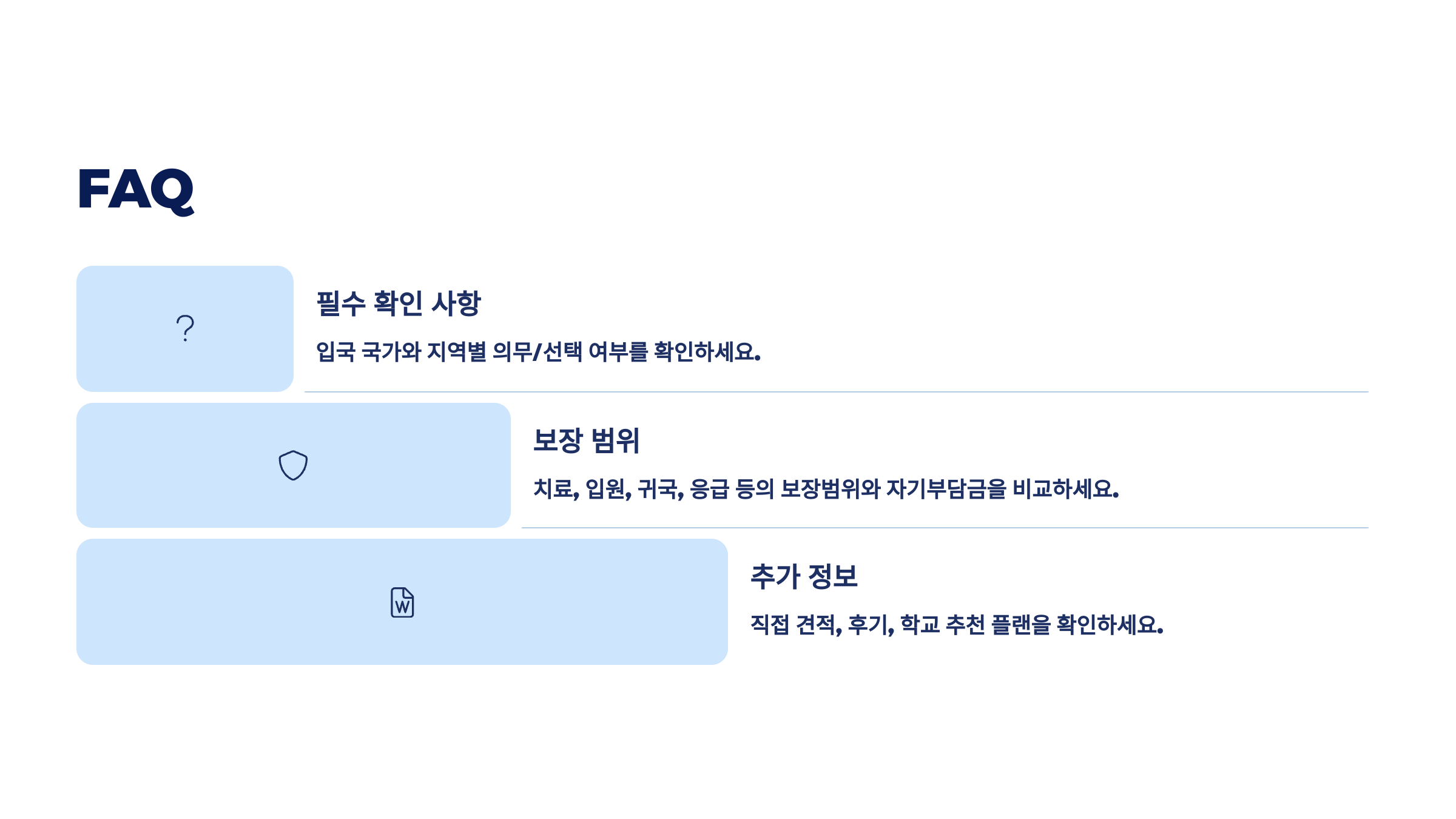 - ① 보험 가입이 비자 조건인가요? → 비자 거절 방지 위해 필수 여부 확인!