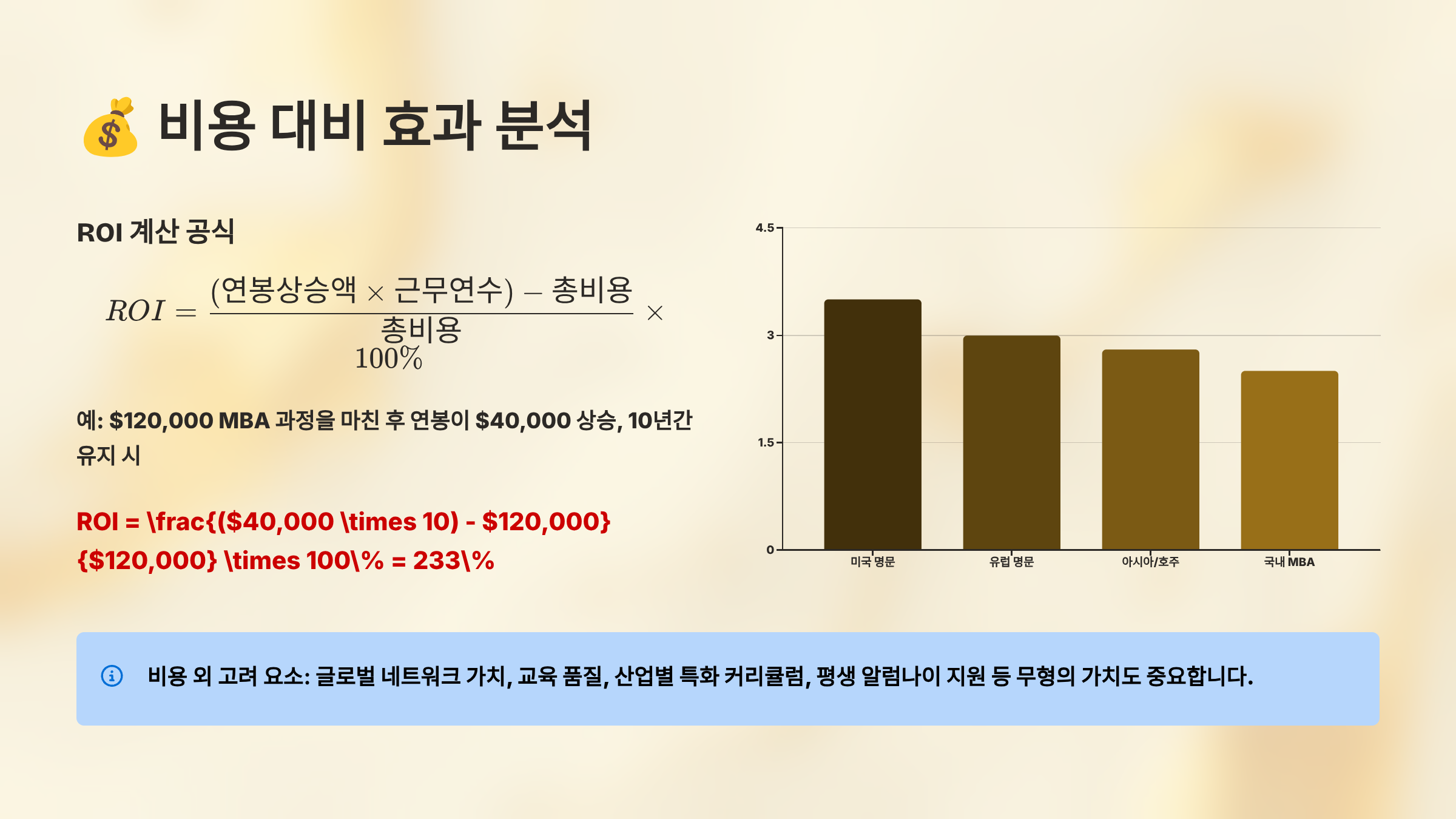기본 공식은 이래요: ROI = [(졸업 후 연봉 - 현재 연봉) × 경력 기간 - 총 투자비용] ÷ 총 투자비용 × 100. 예를 들어 현재 연봉 5,000만원, MBA 후 7,000만원, 학비 3,000만원이라면, 10년 기준 ROI는 567%예요!